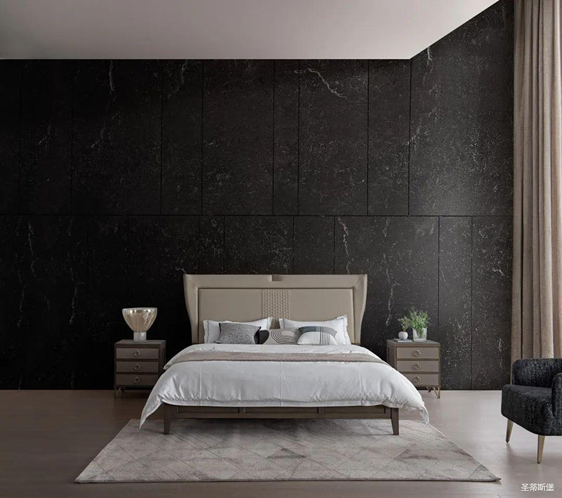 次臥床頭背景沿用了暗色大理石護(hù)墻,空間層次分明,簡約時尚的米色床屏糅合金屬鑲嵌與真皮編織藝術(shù),看似舒適隨意,卻在極簡中透著淡淡的奢華感。大面積的落地窗讓自然光傾入室內(nèi),拉上與床屏同色系的窗簾,令次臥的室內(nèi)空間明暗有度。