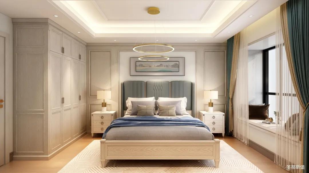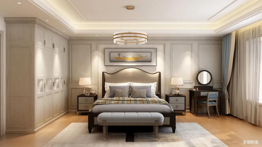 ▲臥室是居家的主要休息場(chǎng)所,在設(shè)計(jì)上需更注重舒適度。所以房間就以和諧淡雅的色彩為主,采用素雅柔和的線條布局,時(shí)尚輕奢的家具,使得空間更加的愜意和浪漫。床頭層林盡染裝飾畫,讓原本略偏美式淡雅的臥室在色彩上更添一筆。