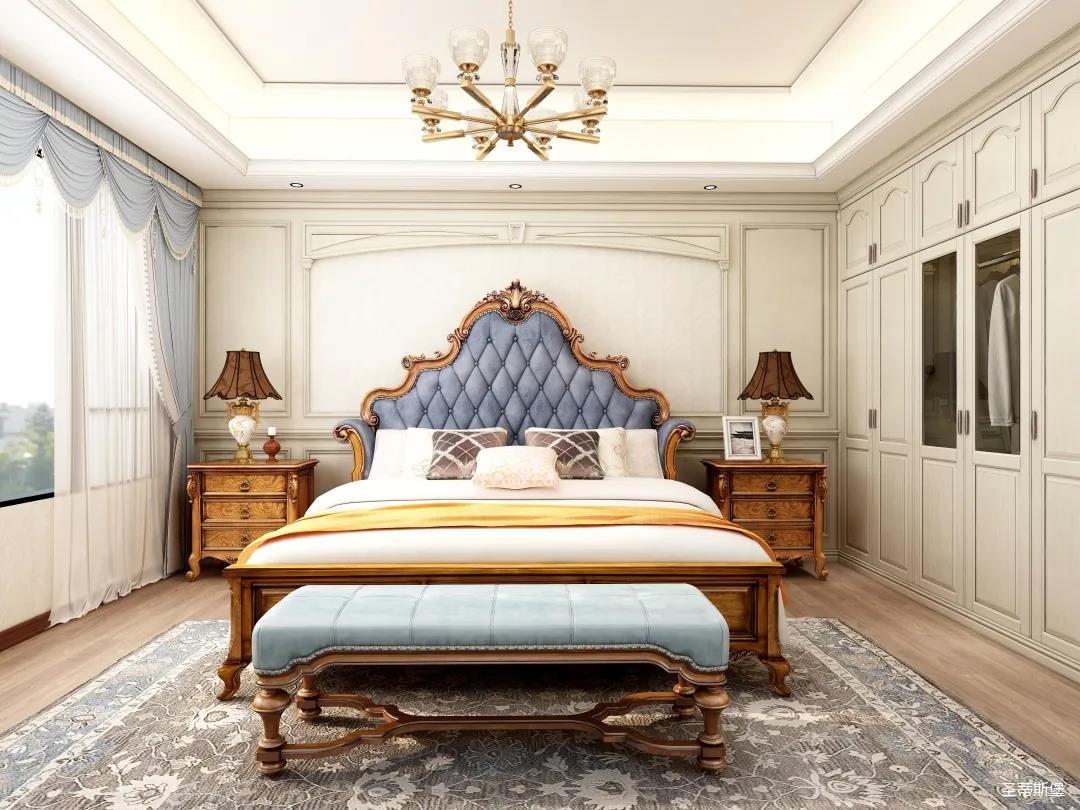 03主臥主臥設(shè)計(jì)運(yùn)用現(xiàn)代的設(shè)計(jì)手法和材質(zhì)還原了古典氣質(zhì),以干練的線條傳達(dá)著溫馨的臥房。蜿蜒的波紋曲線,細(xì)膩精致的雕花,猶如隨風(fēng)起伏的浪花,在清澈藍(lán)的床屏上跳躍,向靜態(tài)空間展示著活躍的動(dòng)態(tài)效果。曲直線條完美融合,打造一個(gè)靈動(dòng)而又精致的生活空間。