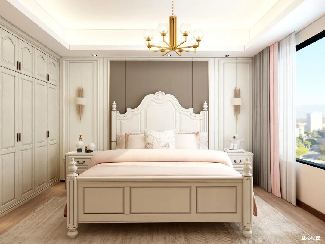 次臥的設(shè)計(jì)更注重收納,人性化嵌入式書桌,整排衣柜設(shè)計(jì)有效的利用了空間每一個(gè)角落。床屏在保持原有美式家具特色的同時(shí),增加了線條美,將繁雜的雕琢簡(jiǎn)化,并融入時(shí)尚的美式元素,壁燈,吊燈糅合自然光影,完美呈現(xiàn)出尊貴的空間格調(diào)。