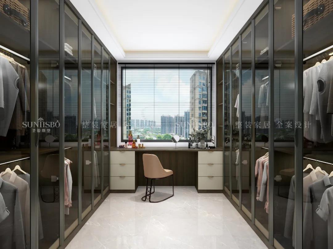 家的質(zhì)感,并不是用瑣碎的東西堆砌而成的,衣帽間是品質(zhì)生活的一個(gè)重要的指標(biāo)。這套衣帽間是以平行的格局設(shè)計(jì)成步入式空間,全開(kāi)放式的呈現(xiàn),金屬與透明玻璃材質(zhì)的糅合,襯托出柜體高級(jí)奢華的質(zhì)感。