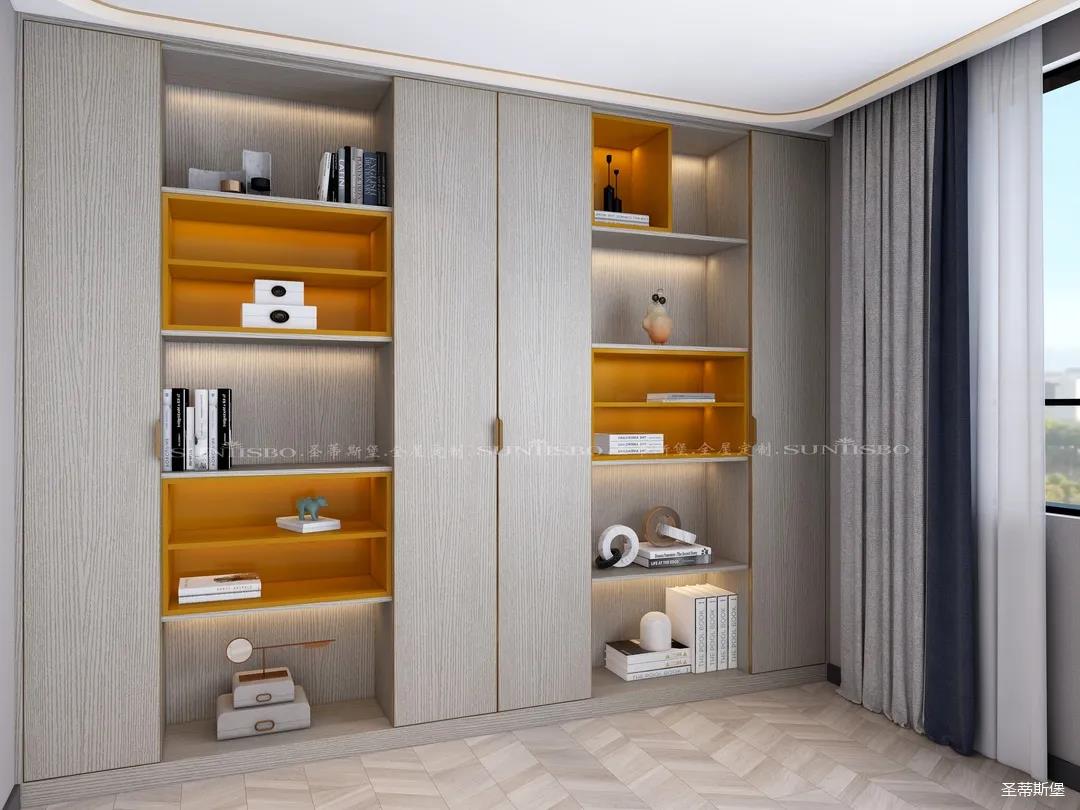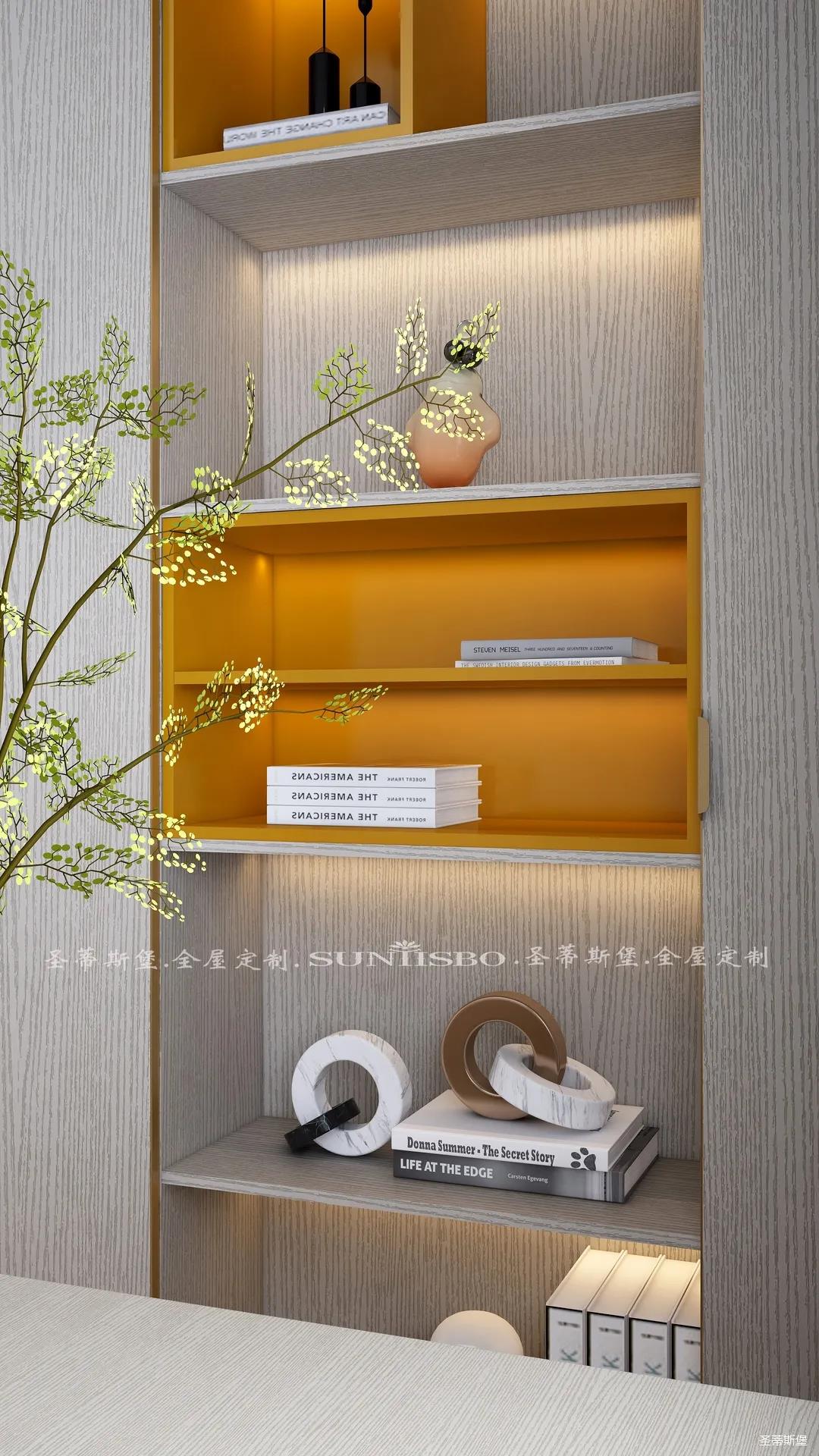 書(shū)柜點(diǎn)綴著適當(dāng)?shù)膼?ài)馬仕橙,除了自身攜帶的高貴氣質(zhì),在聚焦視線(xiàn)的同時(shí),還明確了收納分區(qū)。