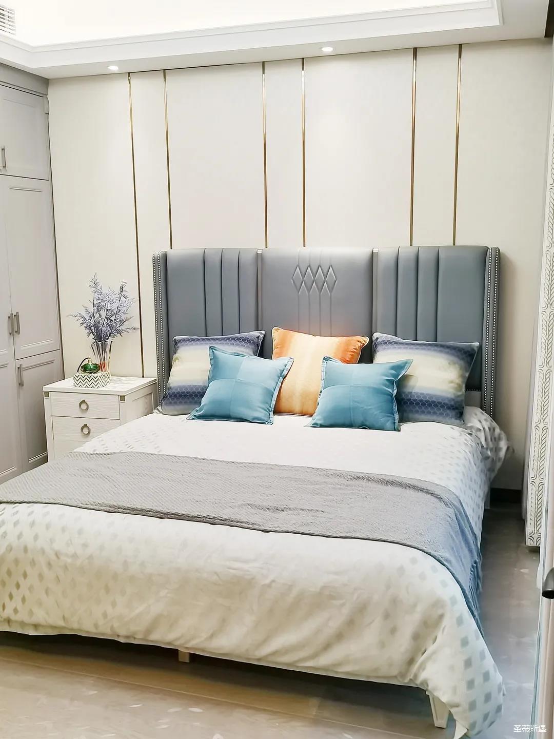 一樓的房間業(yè)主是作為長(zhǎng)輩房,采用輕奢的背景墻面,結(jié)合亮眼的金屬線條設(shè)計(jì),空間顯得時(shí)尚又不失沉穩(wěn)。莫蘭迪色的淺藍(lán)床屏,在無(wú)主燈設(shè)計(jì)與自然光線的碰撞下醞釀出不同的光影美感。