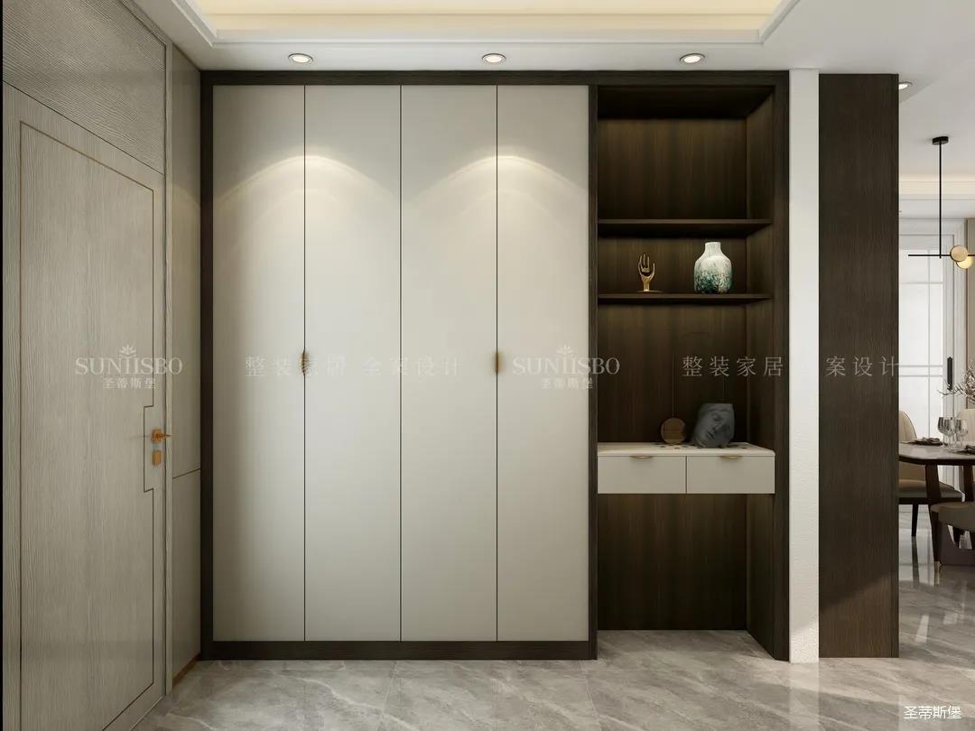 衣帽間采用了虛實(shí)結(jié)合的設(shè)計(jì),構(gòu)筑起規(guī)整而有序的置物區(qū)域和功能齊全的收納系統(tǒng),煙熏色實(shí)木作為空間的主要元素,環(huán)抱著整個(gè)衣帽間,張揚(yáng)又不失沉穩(wěn),恰到好處地搭配金屬玻璃置頂高門和感應(yīng)燈光系統(tǒng),挑高了空間效果,也詮釋著現(xiàn)代極簡線條美感和對極致的生活追求。