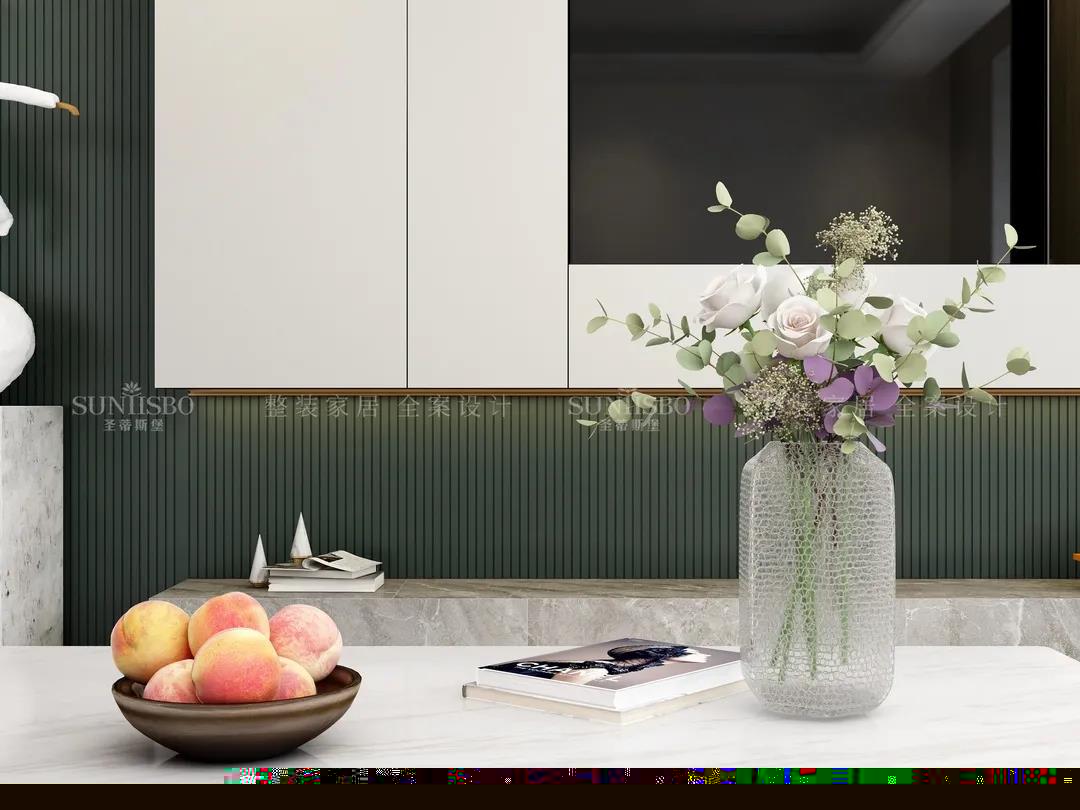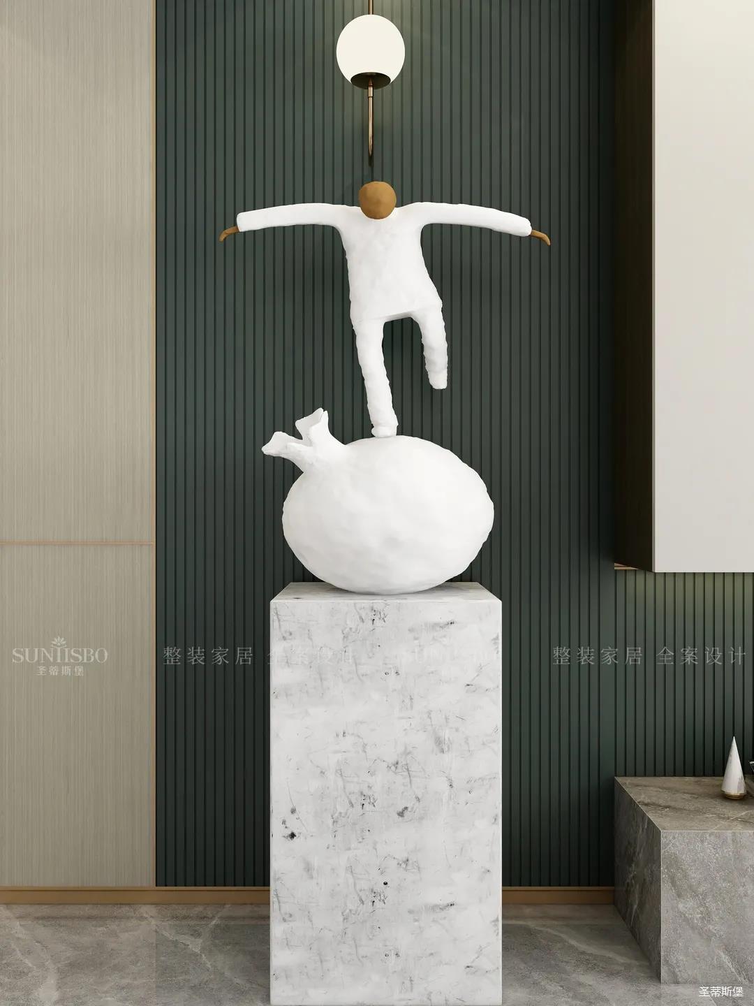 白綠搭配作為當(dāng)下時(shí)尚界的黑馬,一個(gè)沉著冷靜,一個(gè)高級清新,相互碰撞出前所未有的視覺享受。純白異型藝術(shù)雕塑是室內(nèi)和諧的體現(xiàn),也讓空間洋溢著趣味性。