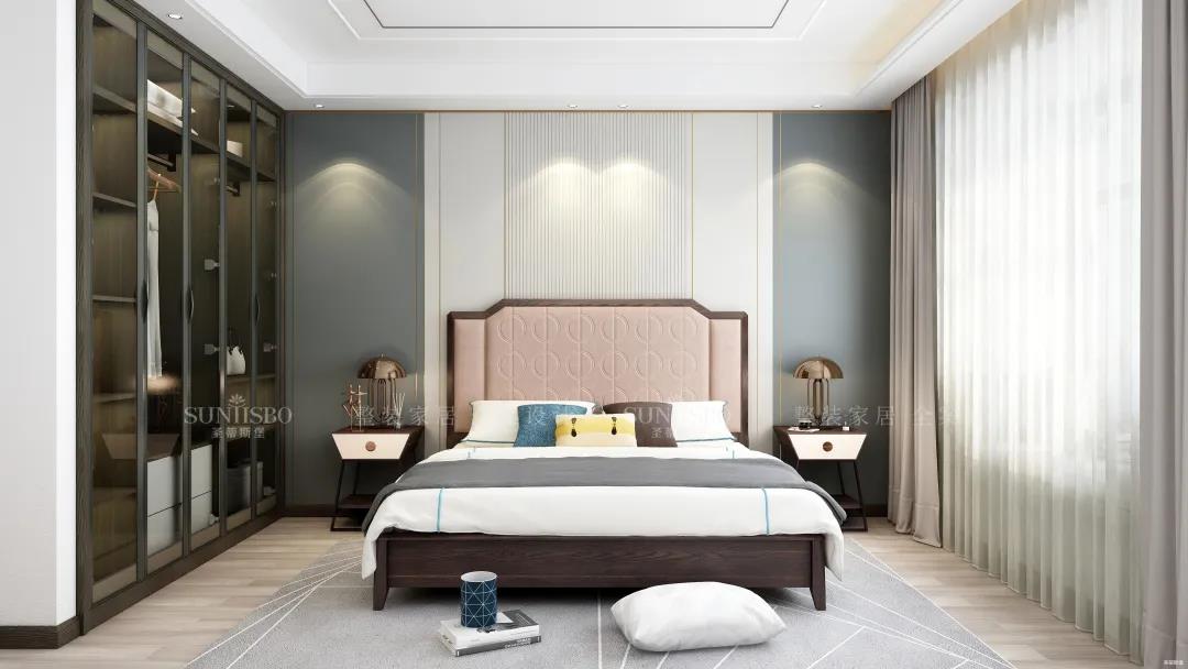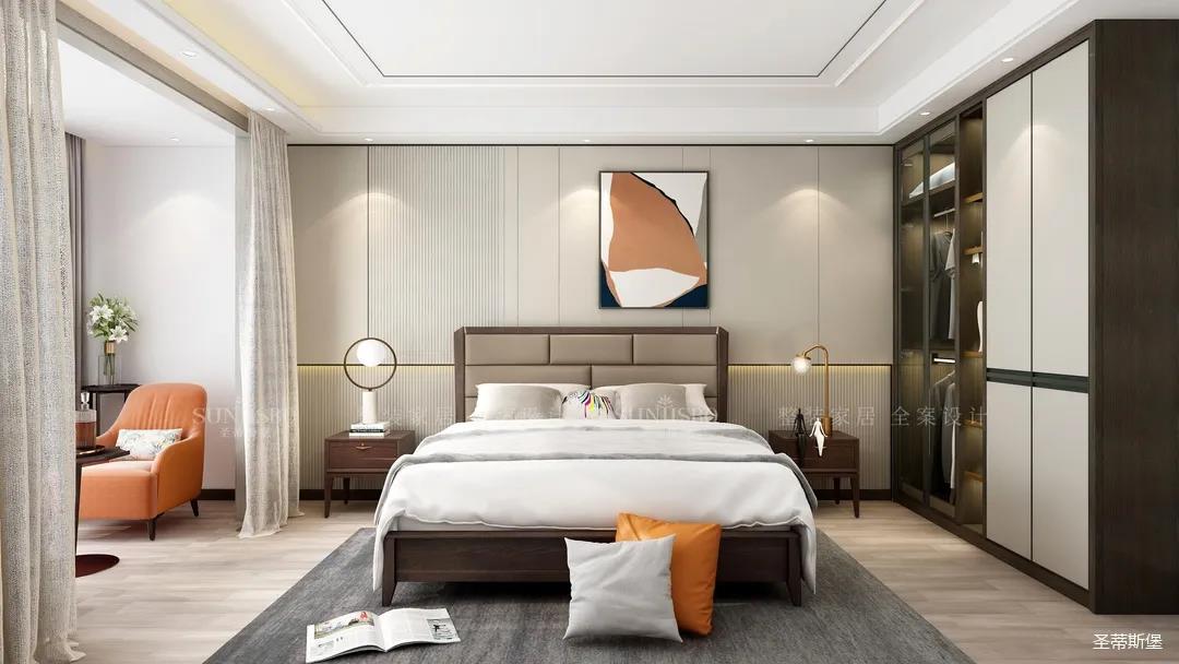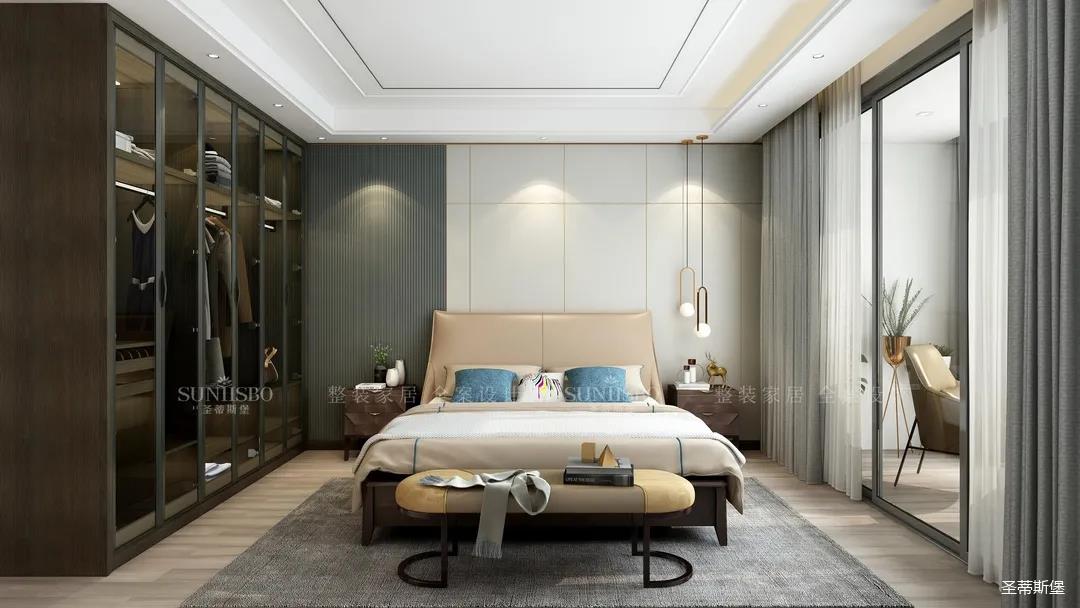 主臥運(yùn)用了大面積落地窗圍合,整體的無主燈設(shè)計(jì),凸顯了空間極簡潮流。無限引入窗外的移動(dòng)光線,輕松為空間注入陽光的溫度,u型極簡金屬懸置著一個(gè)白色造型燈,讓空間從靜謐中生出無窮的變幻。家具設(shè)計(jì)偏向簡約舒適,造型雖不奪目,但細(xì)節(jié)質(zhì)感卻能經(jīng)得起時(shí)光的琢磨與品味。