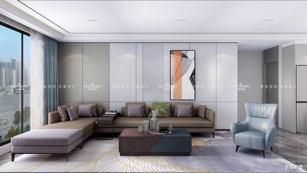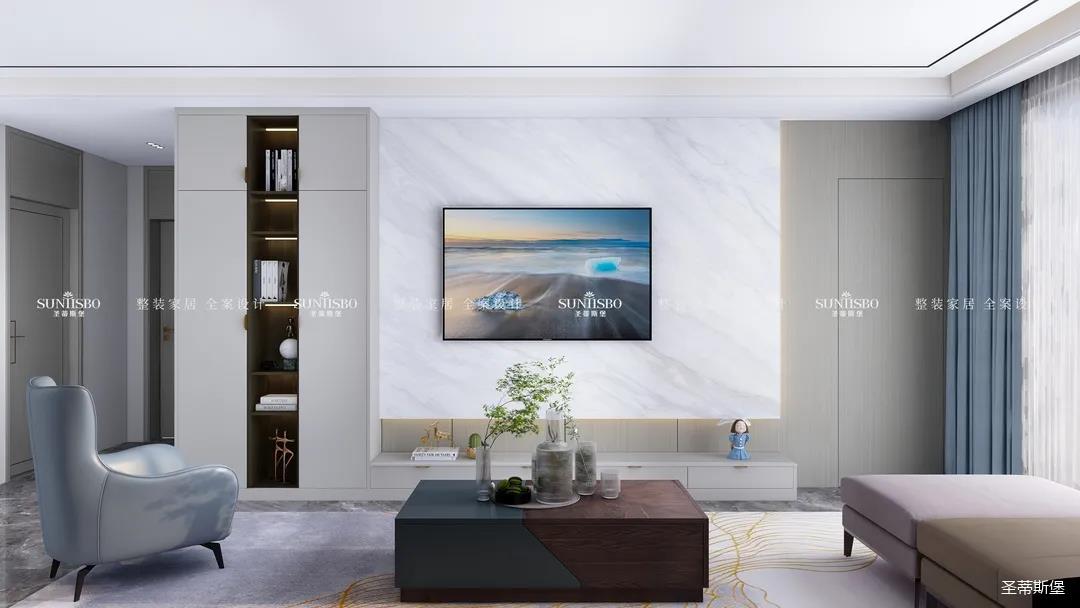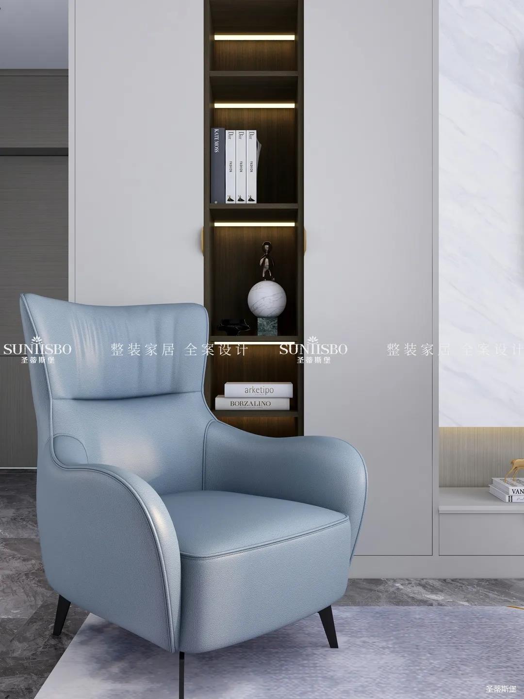 優(yōu)雅淺灰L型定制柜與紋理清晰的大理石組合電視墻,滿足了業(yè)主審美與實(shí)用的雙向需求。一張淡藍(lán)色的休閑椅,讓業(yè)主能感受到亮麗明艷色彩之外的獨(dú)特,低調(diào)不張揚(yáng),卻在溫潤(rùn)中傳遞出色彩的力量。通過(guò)紋理清晰的護(hù)墻為底,為柔和優(yōu)雅的靜態(tài)客廳增添了層次感十足的空間律動(dòng)。