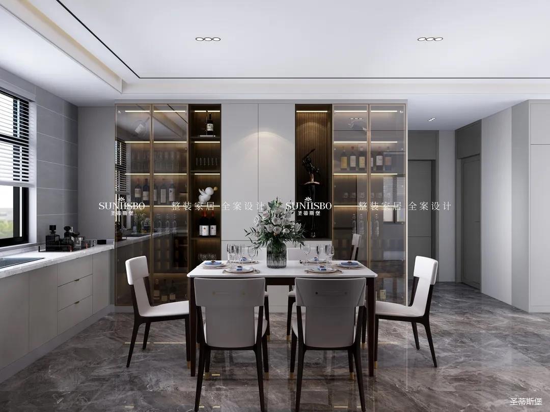 餐廳中大理石肌理的桌面自然袒露,自然親膚的觸感、皮革質(zhì)感的現(xiàn)代餐椅坐感舒適自然。沉穩(wěn)的實(shí)木材質(zhì)延伸,精致的瓷白餐盤搭配金屬質(zhì)感的物件,通透的玻璃器皿點(diǎn)綴其中,契合了業(yè)主對(duì)品質(zhì)生活的追求。