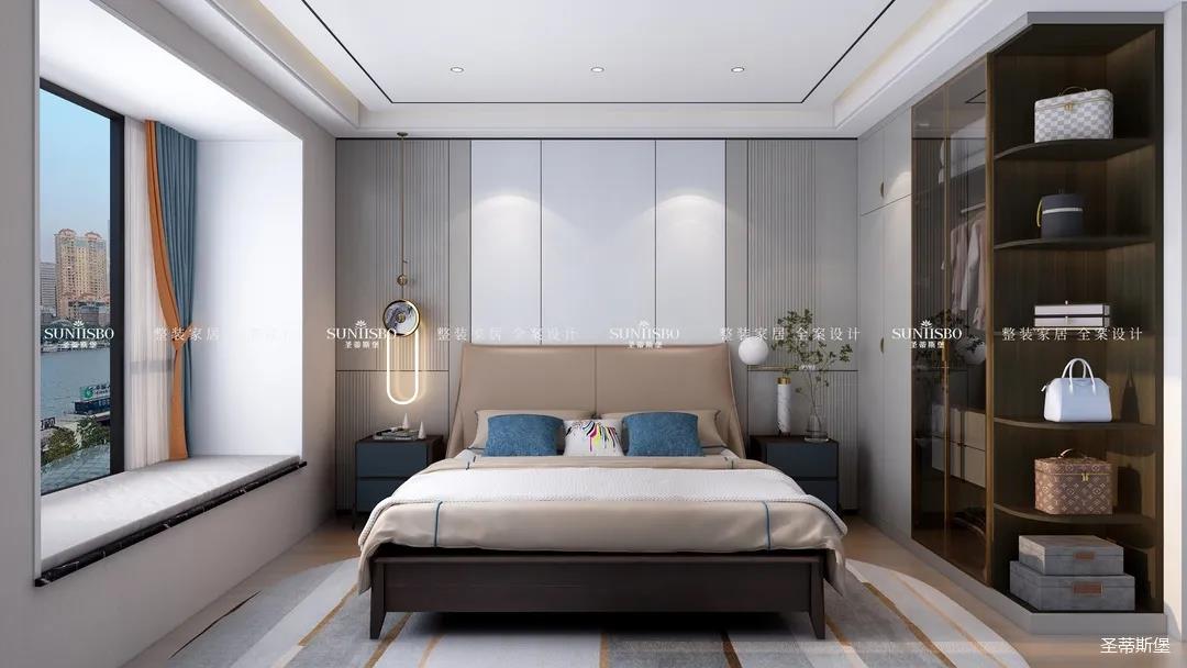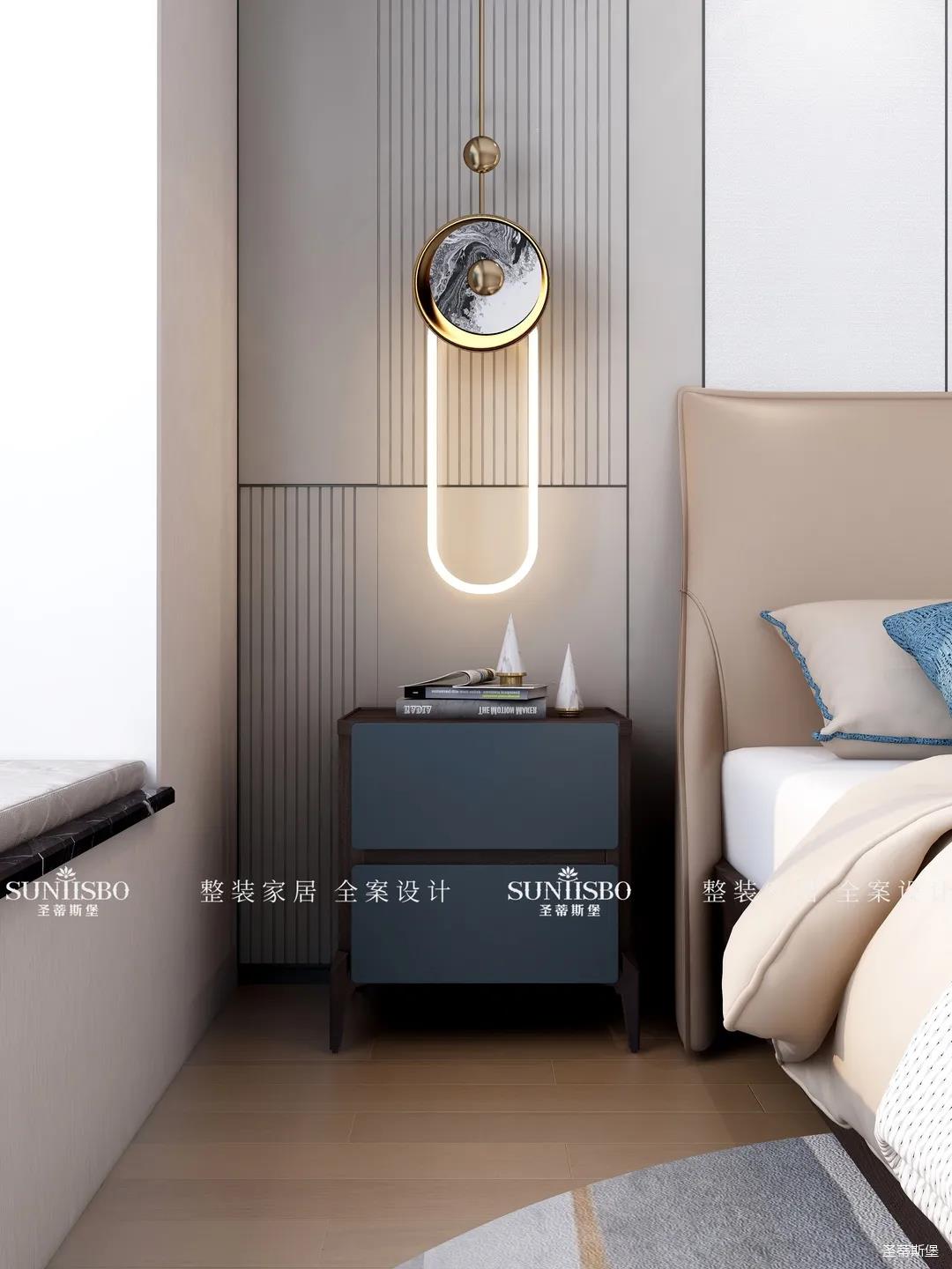 臥室把自然光線納入空間。穩(wěn)重的淺咖色床屏搭配柔和的灰白護(hù)墻,渲染了空間去繁從簡(jiǎn)的設(shè)計(jì)。品質(zhì)精致的床品面料觸感自然柔軟,真皮質(zhì)地的家具匹配空間氣質(zhì),為業(yè)主營(yíng)造了舒適愜意的休憩空間。