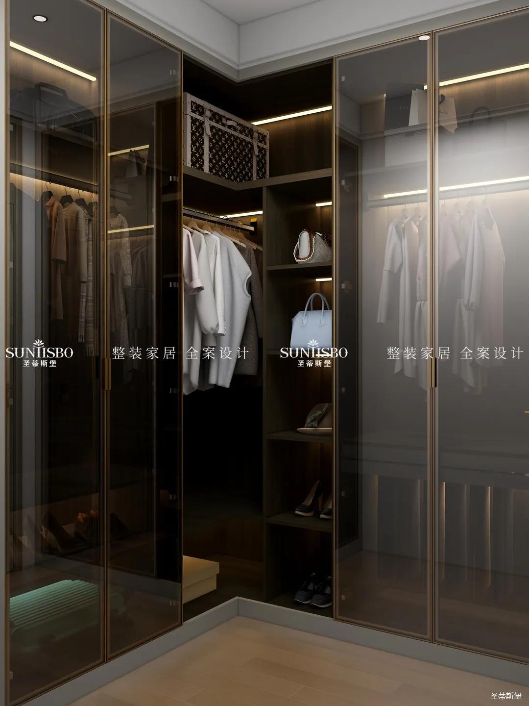 L型衣帽間采用了玻璃與實(shí)木組合,用時(shí)尚的煙熏色打造純凈質(zhì)感,避免了全實(shí)木柜門的無(wú)趣。人性化的分區(qū)包含了鞋架、褲架、首飾收納等,將衣帽間的實(shí)用性靈活設(shè)計(jì)成業(yè)主的收納習(xí)慣。