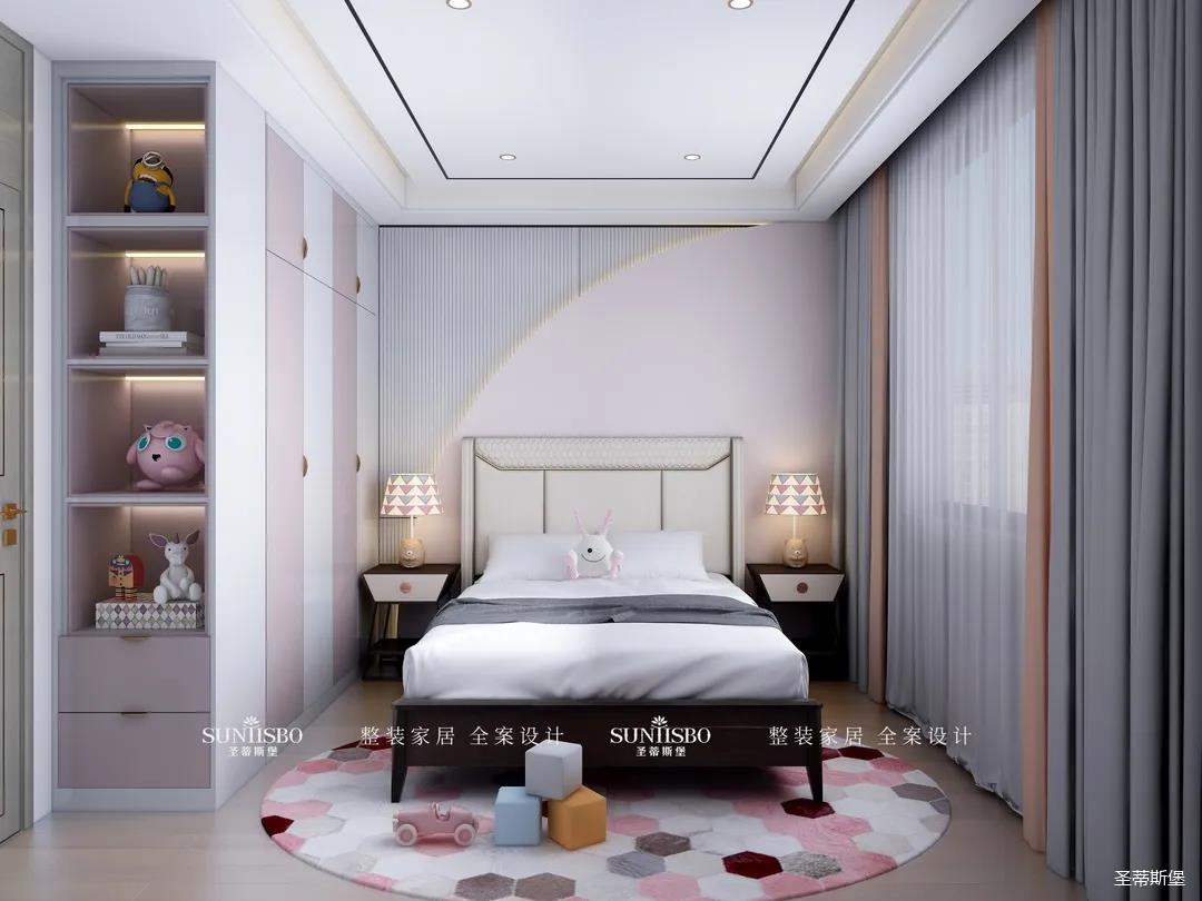 兒童房相對(duì)于其他空間更立體自然,幾何紋理的床屏和床頭柜延續(xù)了空間獨(dú)特的設(shè)計(jì)元素,菱格形的地毯,色彩交錯(cuò)排列,滿足了兒童房應(yīng)有的童真與想象力。粉白相間的定制收納,搭配同色系充滿童趣的動(dòng)物公仔擺件,儼然成為了兒童的夢(mèng)幻小天地。