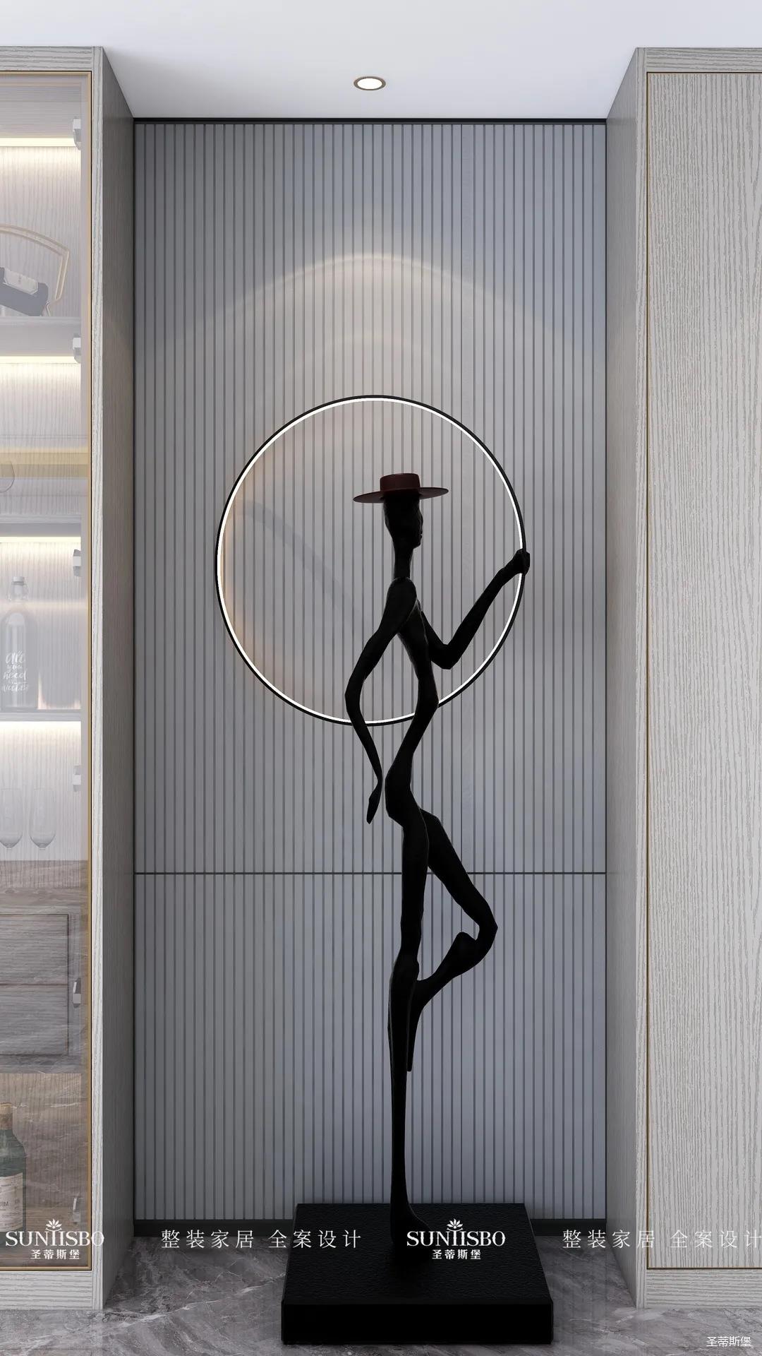 造型獨(dú)特的人形裝飾佇立在過(guò)道與玄關(guān)之間,充滿優(yōu)雅氣息。淺灰的線性紋理背景搭配黑色的造型,彰顯著居者時(shí)尚的生活品位。