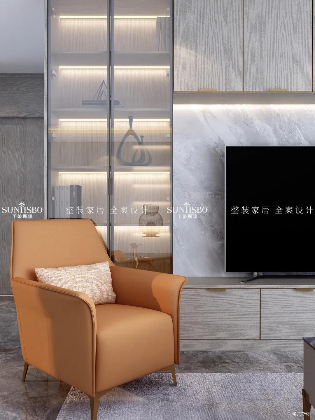 高級(jí)灰+活力橙,是百看不厭的經(jīng)典搭配,當(dāng)冷靜與熱情碰撞,為客廳奠定了時(shí)尚優(yōu)雅的基調(diào)。設(shè)計(jì)師以定制柜為原型,打造出兼具實(shí)用與裝飾功能為一體的電視背景墻,金屬包邊的柜體,在幾何燈光的照耀下散發(fā)出光澤,提升了整體空間的質(zhì)感,也撩動(dòng)著我們的心弦。