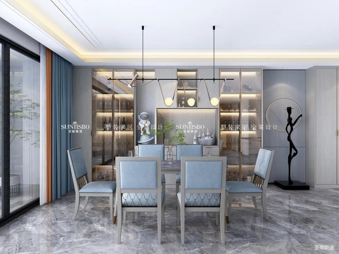從優(yōu)雅中款款而來(lái),高級(jí)灰與霧霾藍(lán)的冷靜色調(diào)勾勒出一個(gè)高貴而又摩登的用餐空間。設(shè)計(jì)師從玄關(guān)直入打造一排定制柜體,包含了玄關(guān)和餐邊柜,藝術(shù)燈形與時(shí)尚餐椅弧形相呼應(yīng),營(yíng)造出溫暖柔和的用餐環(huán)境。