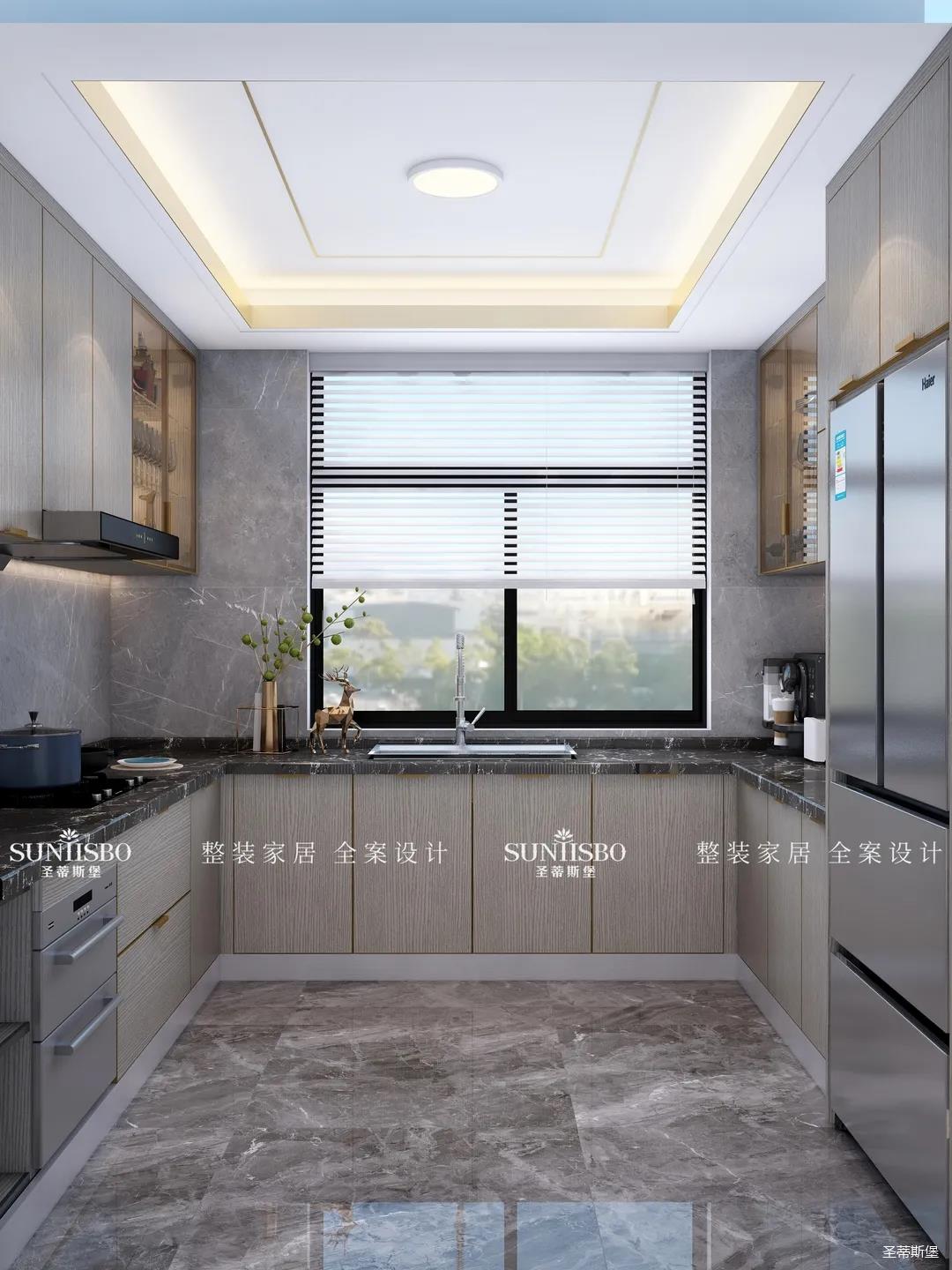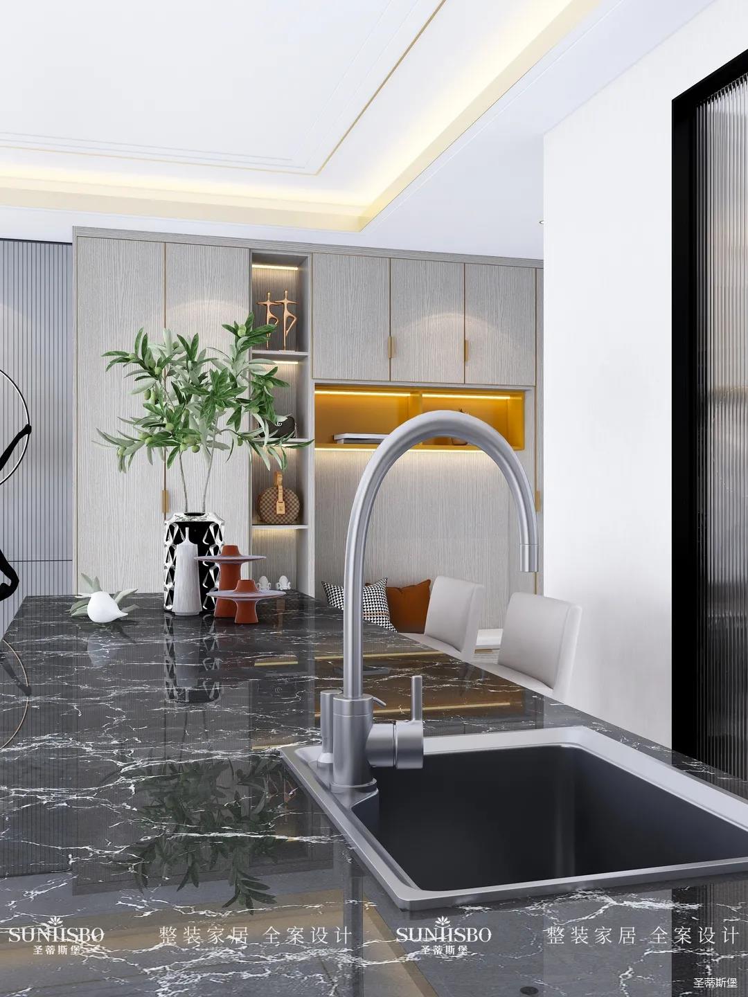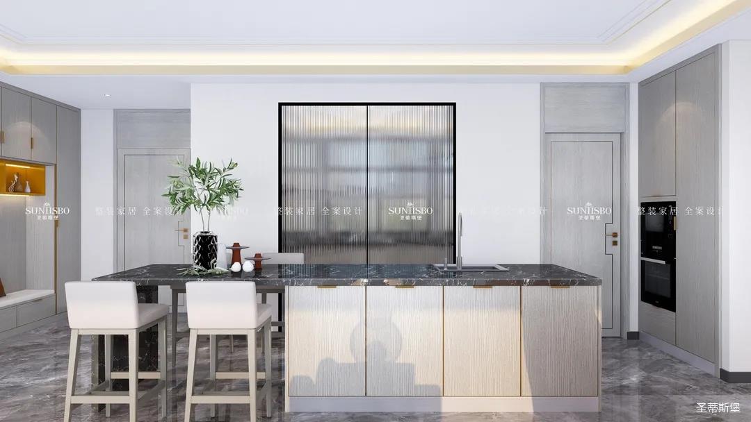 設(shè)計(jì)師以廚房&西廚區(qū)為布局的中軸,打開(kāi)左右空間,延伸出廚房動(dòng)線功能區(qū),增加西廚區(qū)域,有效延伸空間。設(shè)計(jì)師打造了下午茶專屬的中島臺(tái),中島臺(tái)與客廳串連,方便屋主隨時(shí)分享美食樂(lè)趣。