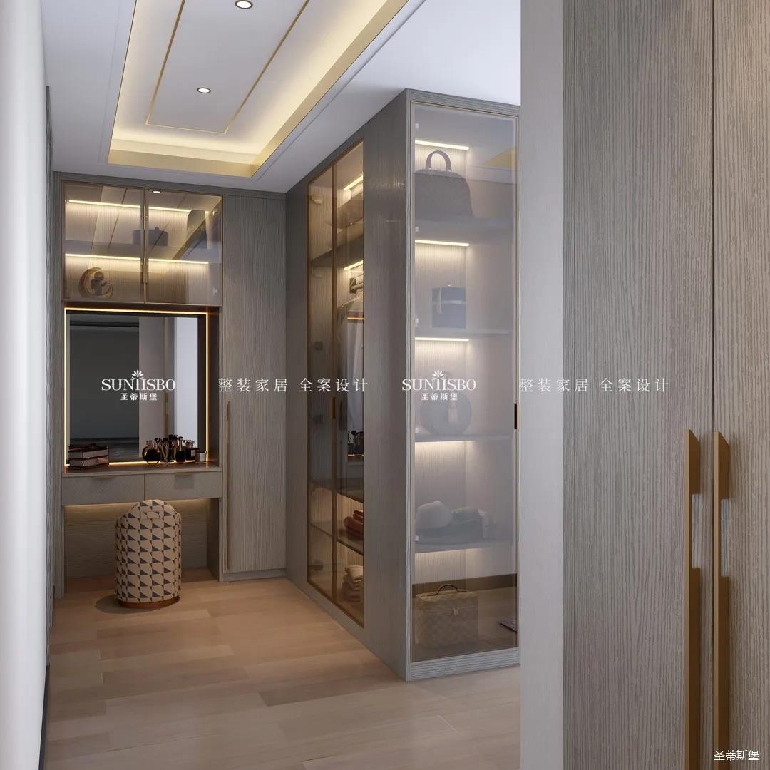 半開(kāi)放式衣帽間分隔了主臥與梳妝兩個(gè)獨(dú)立空間,金色是詮釋華貴最直接的表達(dá),將金屬鑲嵌于玻璃材質(zhì)與實(shí)木之間,令空間光芒透射加倍。