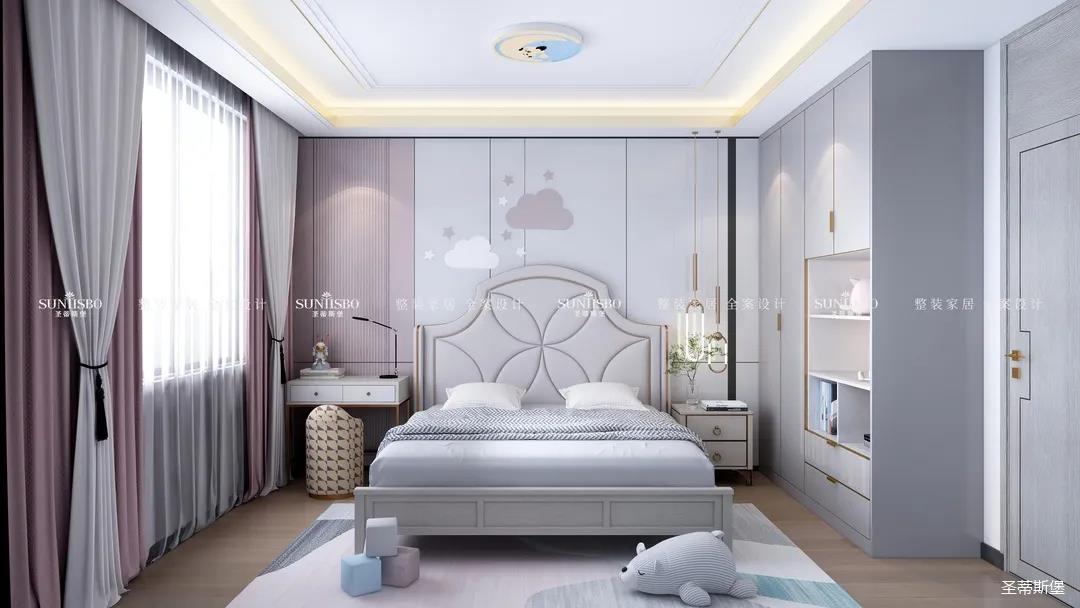 兒童房以粉白為基調(diào),醞釀著世間充滿童真和浪漫的語(yǔ)言。四照花型的床屏,讓人聯(lián)想到被粉色鮮花包圍的公主王國(guó)。封閉式的收納衣柜增加了開(kāi)放式的兒童玩偶展示區(qū),溫馨又浪漫,讓小孩在童話王國(guó)里長(zhǎng)大。