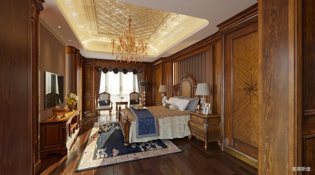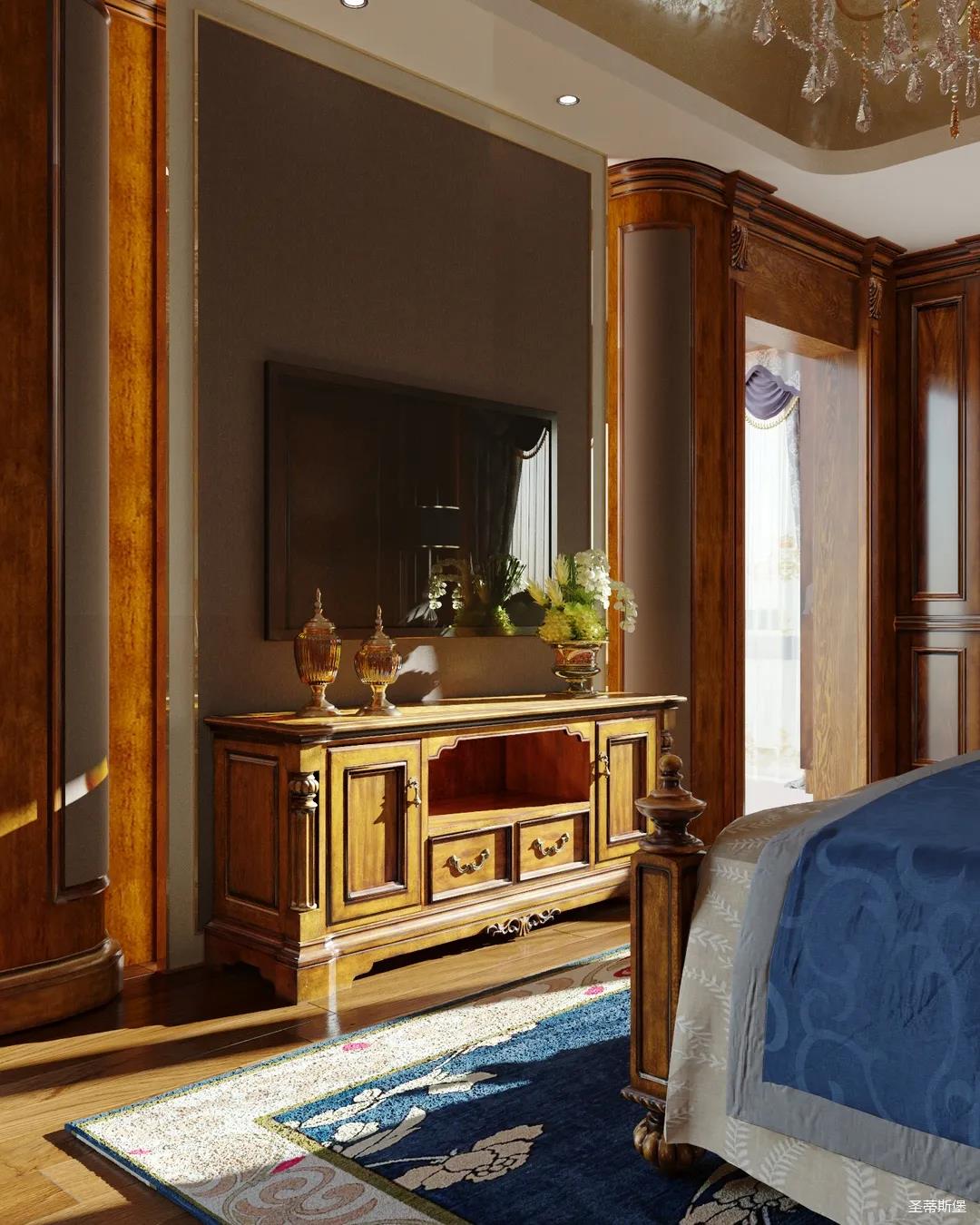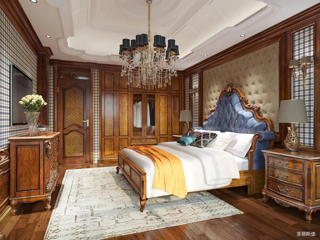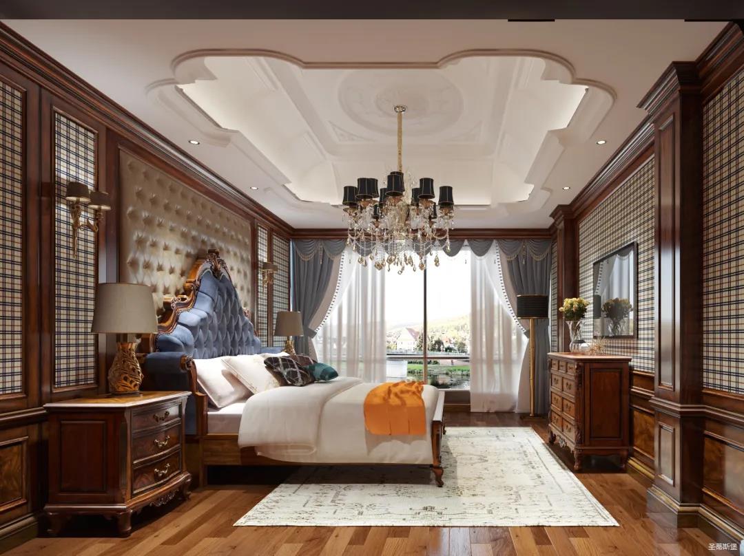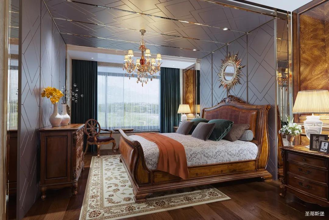 主臥整體設(shè)計(jì)是美式與現(xiàn)代的完美整合,既保留了純正美式的形和實(shí)木雕刻藝術(shù),又具有濃重的美式配色,濃濃的藝術(shù)氣息不自覺(jué)在浪漫的美式空間流淌。流暢的弧線花飾以及豐富的木作線條別具匠心。大氣穩(wěn)重與舒適雅致并重,并借由開(kāi)放的布局、靈活的動(dòng)線,共同促成了整個(gè)空間極具復(fù)古浪漫的情調(diào)。