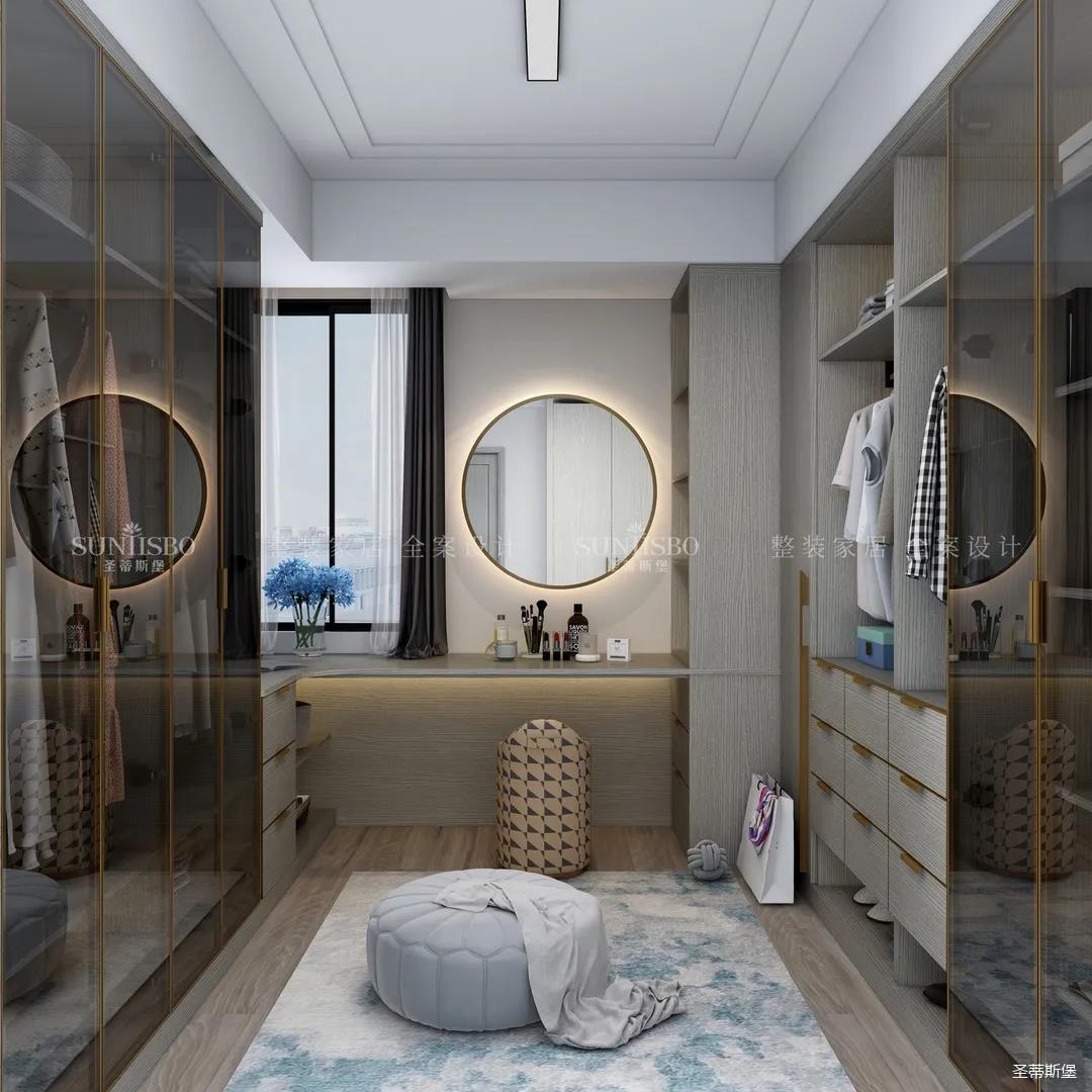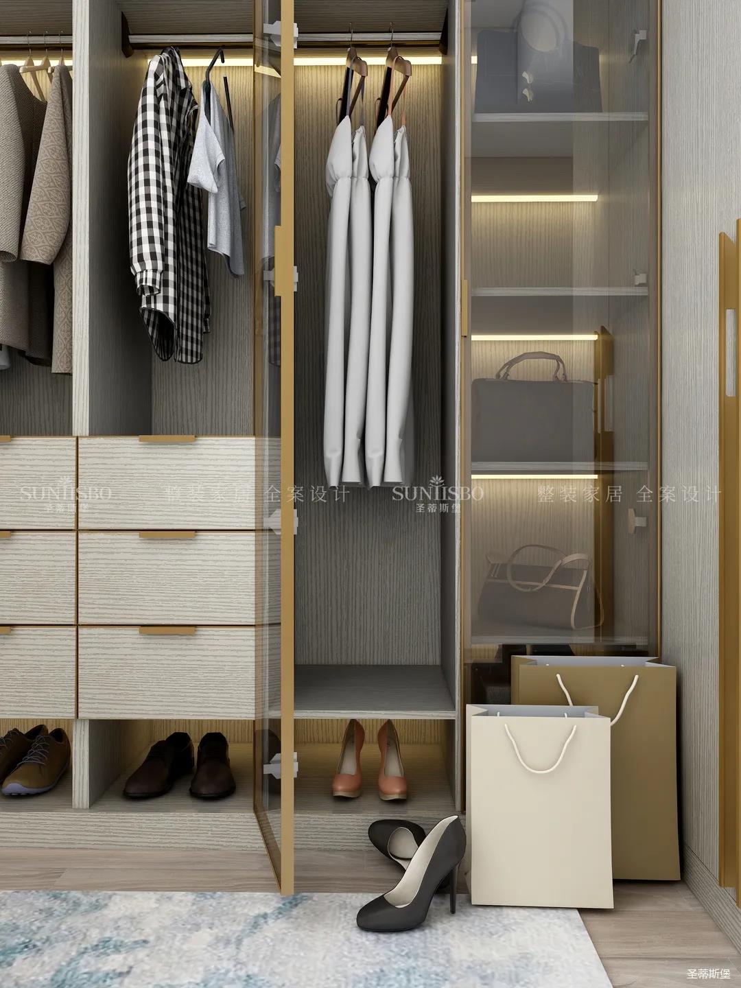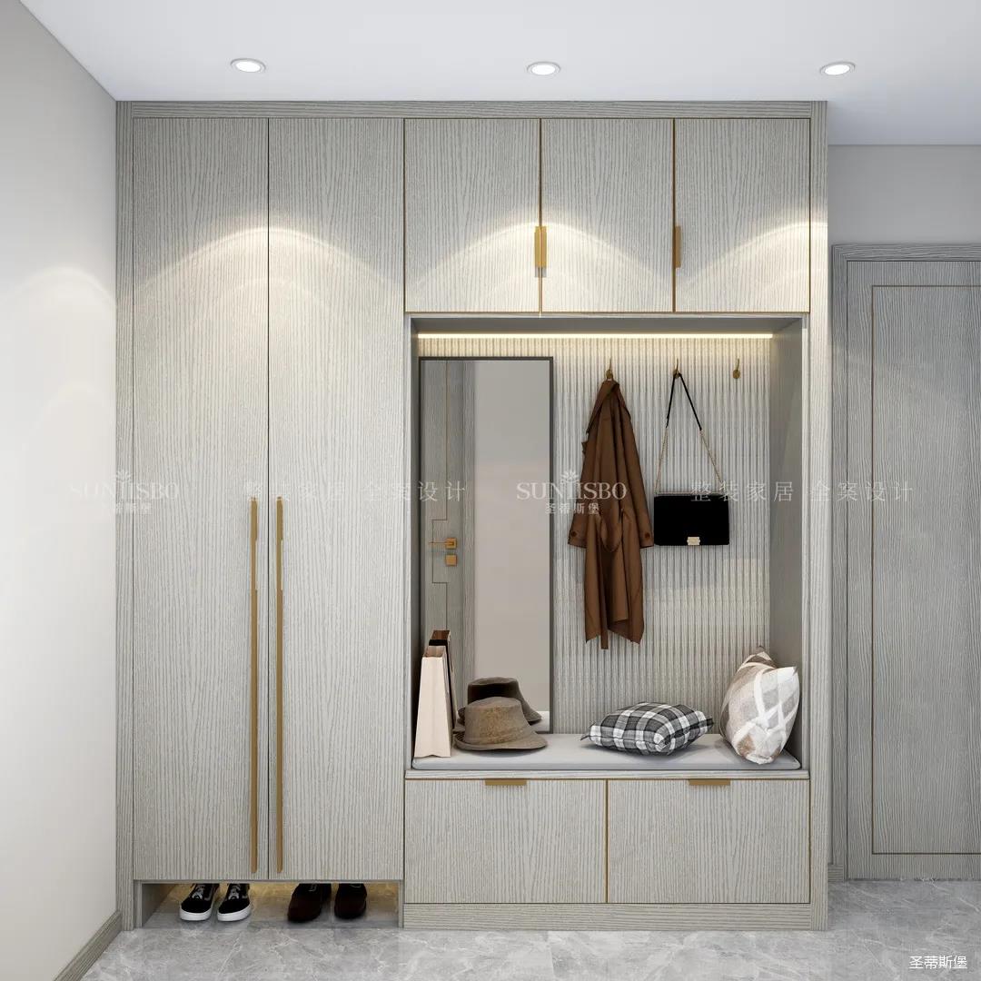 進入玄關(guān)區(qū)域就能感受到房主對時尚風格的偏愛,實木元素與簡奢金屬的碰撞,既有對材質(zhì)的甄選,又有現(xiàn)代簡奢的品質(zhì)感。穿衣鏡、換鞋凳、收納柜等藏漏有序的分區(qū),將屋主的生活歸納的井井有條。