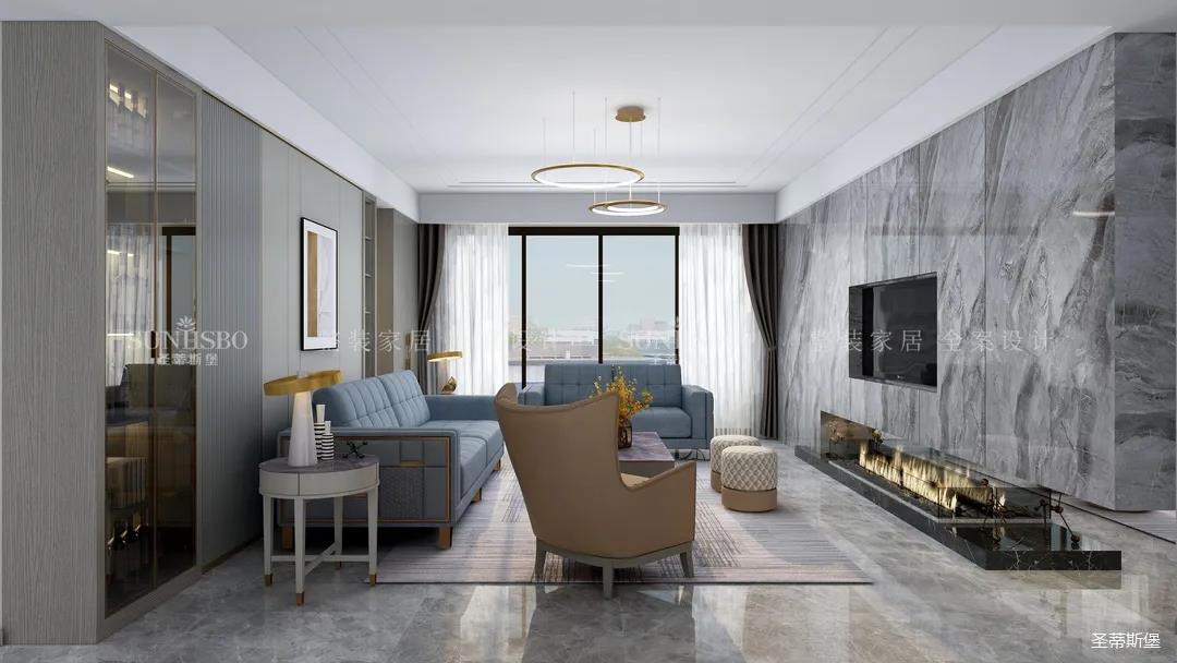 精細結(jié)構(gòu)下沙發(fā)角幾的微金屬結(jié)構(gòu),干凈利落,彰顯質(zhì)感。整面大理石背景墻將電視設計為壁龕結(jié)構(gòu),底部的裝飾壁爐讓家的溫馨感再度升級。