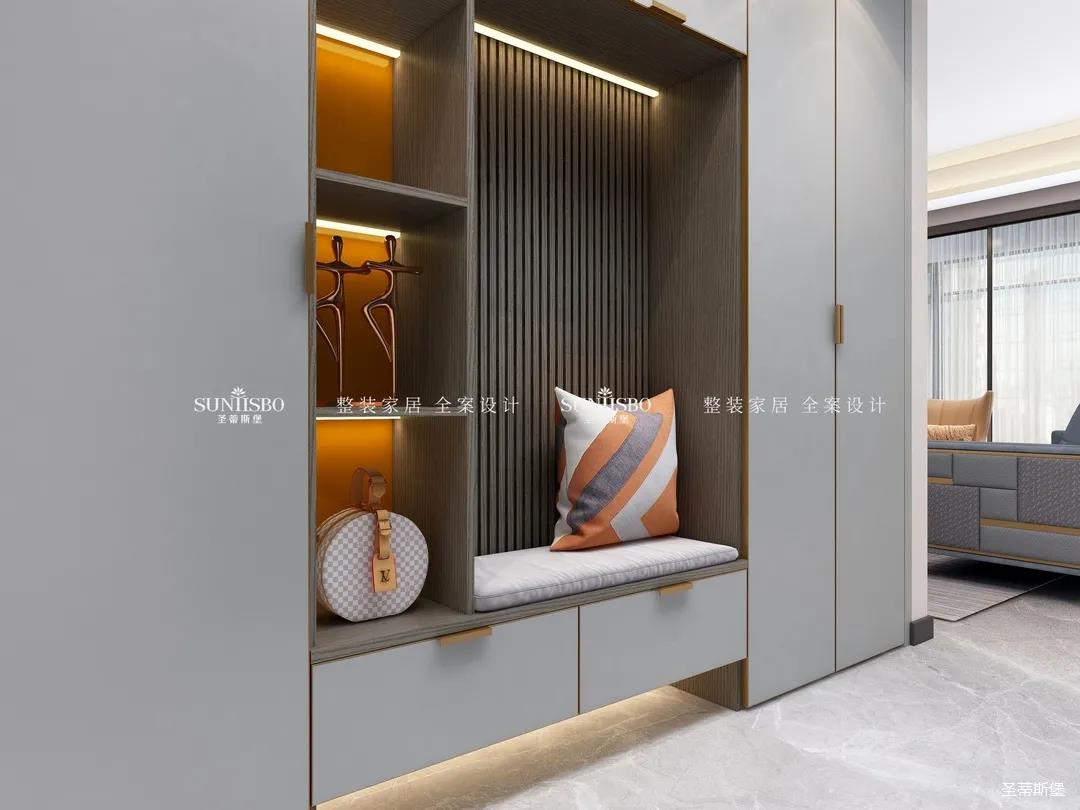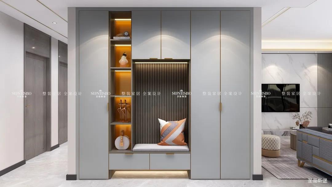 開(kāi)門(mén)即見(jiàn)寬敞實(shí)用的玄關(guān)柜體。暖黃色的燈帶,不僅增加了室內(nèi)環(huán)境的層次感,更是創(chuàng)造了隱形的光環(huán)境。