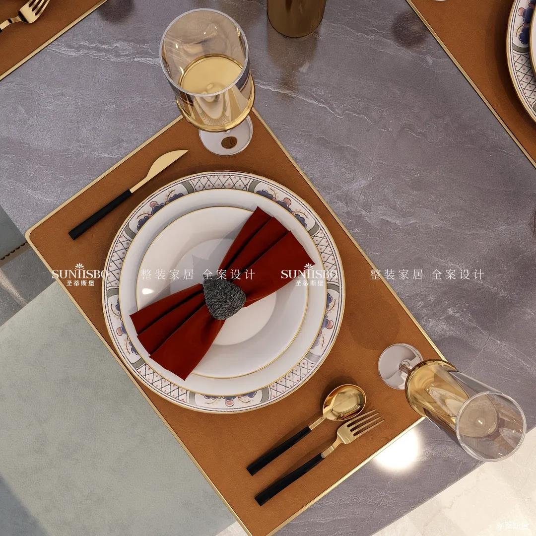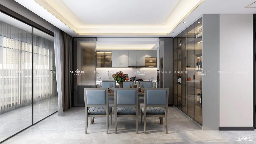 設(shè)計(jì)師通過(guò)對(duì)居者在空間中互動(dòng)關(guān)系的細(xì)致設(shè)想,遵循經(jīng)典的簡(jiǎn)奢風(fēng)格設(shè)計(jì),細(xì)膩考究人居與空間關(guān)系,反復(fù)推敲布局,將客餐廳橫列排布,增加居者的交流互動(dòng)。