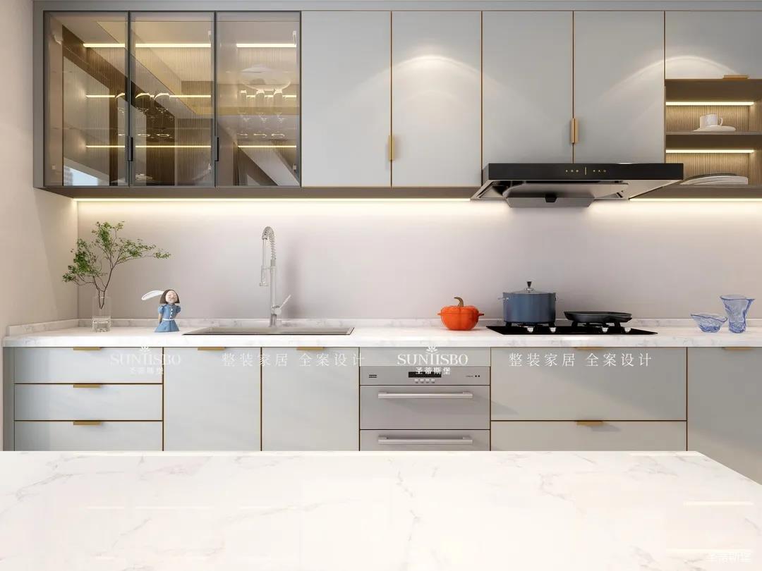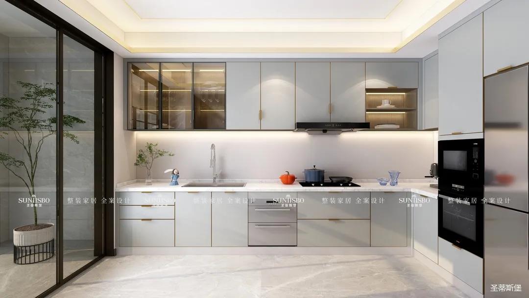 廚房現(xiàn)代智能的設(shè)計(jì)對(duì)精致生活進(jìn)行了全新的詮釋?zhuān)瑫r(shí)也呈現(xiàn)了居者追求精簡(jiǎn)生活的內(nèi)涵。智能的廚房電器嵌入同色系的柜體中,時(shí)尚科技感十足。