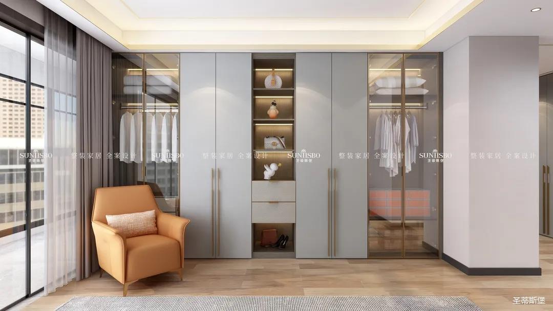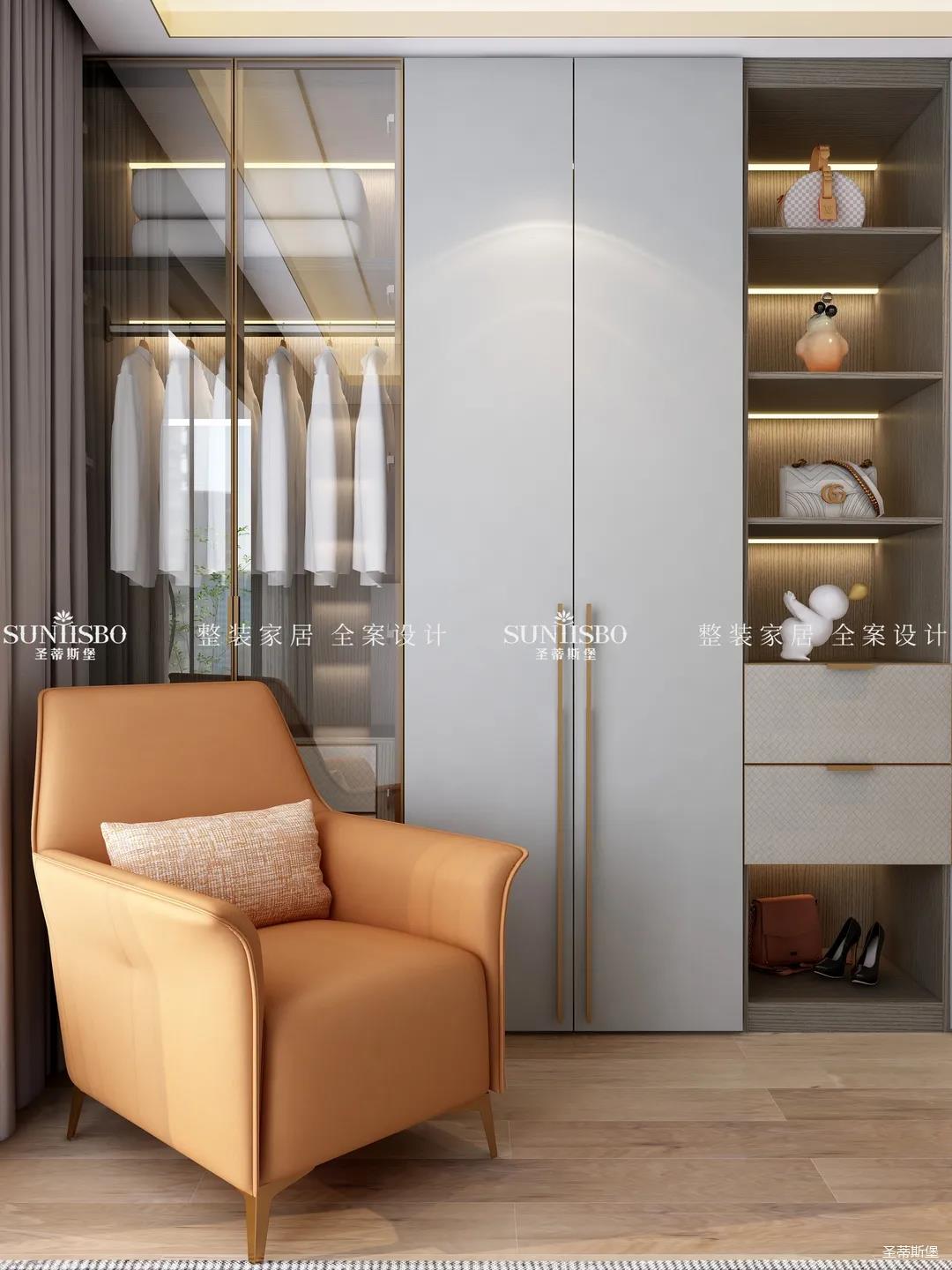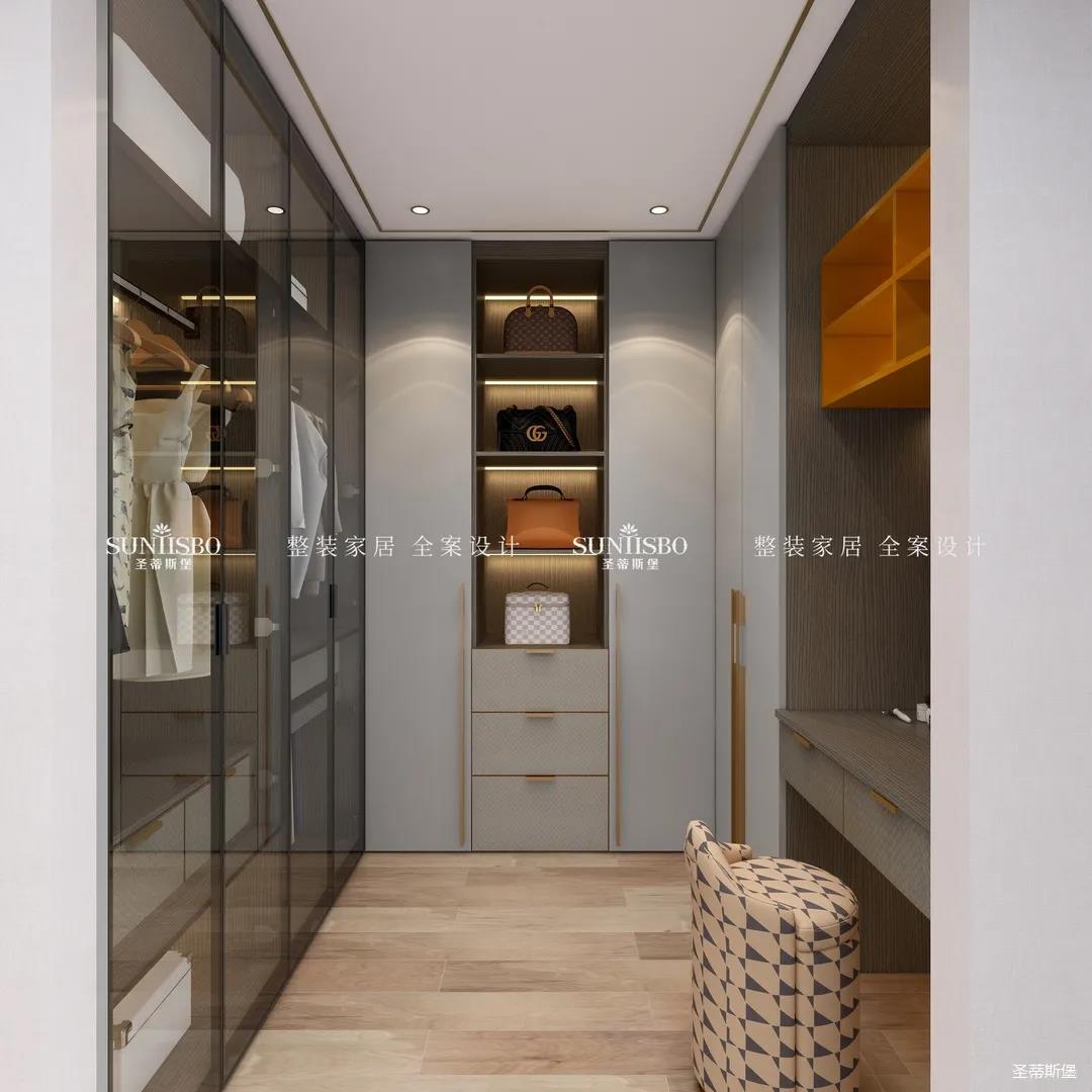 衣帽間選擇淺灰作為空間主色調(diào),設(shè)計(jì)師在衣帽間用與整體空間相似的愛(ài)馬仕橙作為點(diǎn)綴,使空間具有“簡(jiǎn)于形,奢于心”的時(shí)尚審美內(nèi)涵。