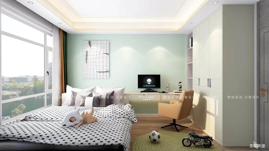 兒童房是清新的淺綠格調(diào),時(shí)尚個(gè)性又不失溫馨舒適。衣柜與墻體深淺色完美匹配整體硬裝,協(xié)調(diào)統(tǒng)一。黑白圓點(diǎn)棉質(zhì)床品與壁畫(huà)形成同色系搭配,充盈了空間的飽滿度。