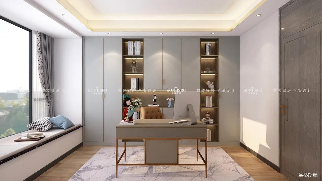 書(shū)房以淺灰作為主色調(diào),設(shè)計(jì)師在整個(gè)空間沒(méi)有選擇其他顏色進(jìn)行相互雜糅,讓書(shū)房完全釋放了簡(jiǎn)約的風(fēng)格,無(wú)主燈的設(shè)計(jì)理念更是突出了空間層次感。細(xì)膩且富有光澤的金屬元素鑲嵌,在繁華的都市中傳遞著特有的文化氛圍。