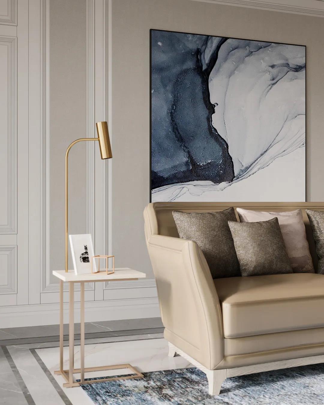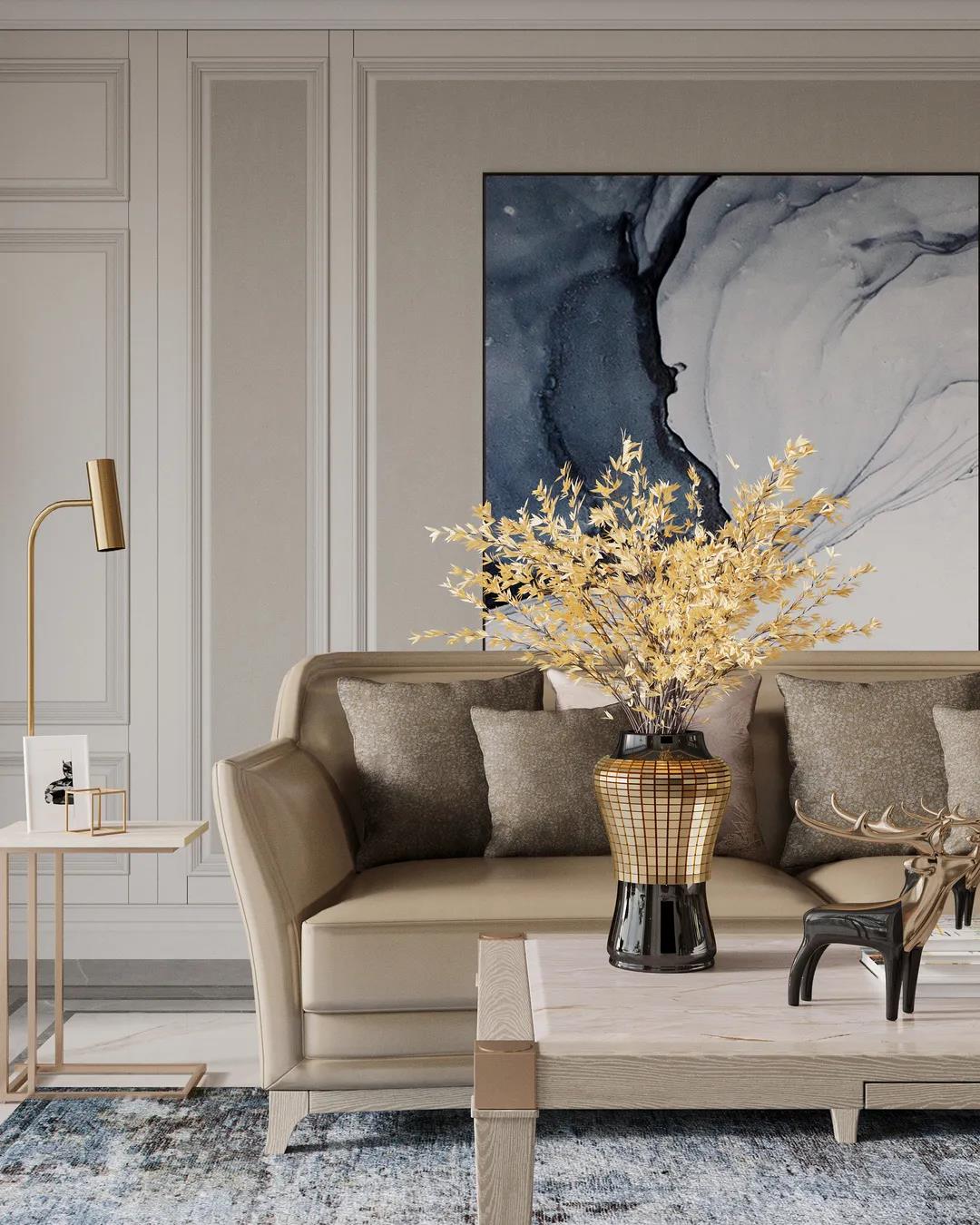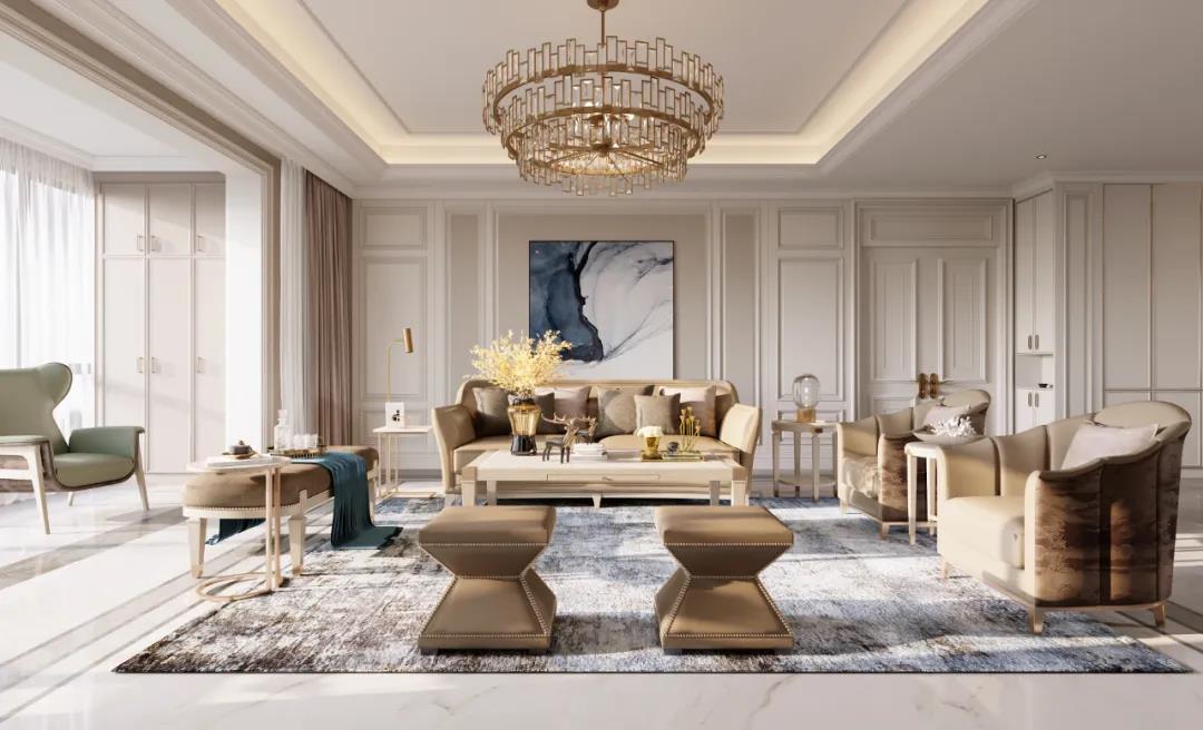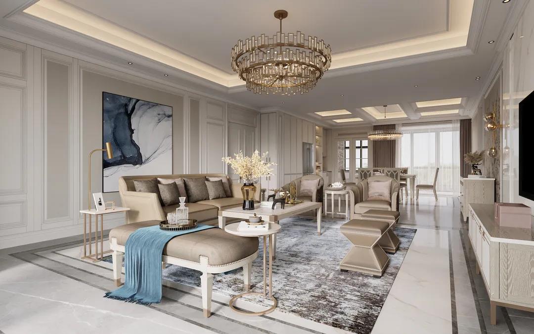 本案定位美式輕奢風格,設計師提取了業(yè)主喜歡的顏色添加至空間中,并運用金屬元素滲透到每一個空間,統(tǒng)一色調。在設計上,格局大而不空,以優(yōu)美線條雕琢空間語言,材質肌理間的碰撞融合,打造出層次豐富的藝術感。