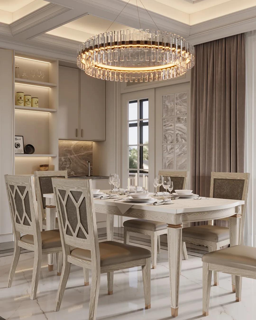 在華麗而精致的餐廳中,仿古白的餐桌椅搭配通透的水晶高腳杯,兩者交相輝映,用餐儀式感十足。墻面的護墻板和酒柜呈現(xiàn)一字型設計,一方面增添空間整體的豐盈感,還強調出個性現(xiàn)代的輕奢布局。