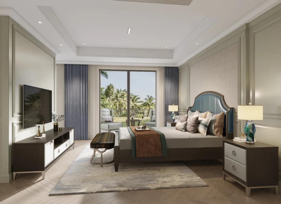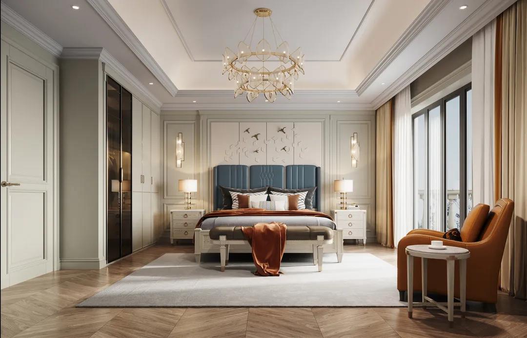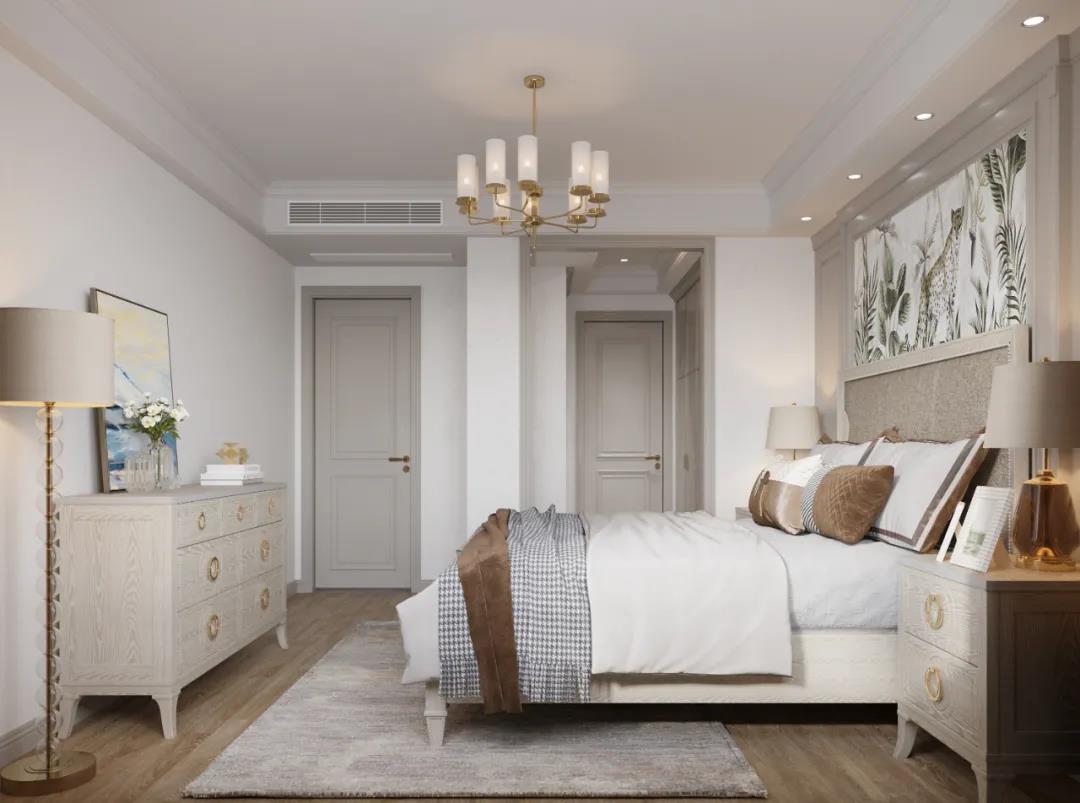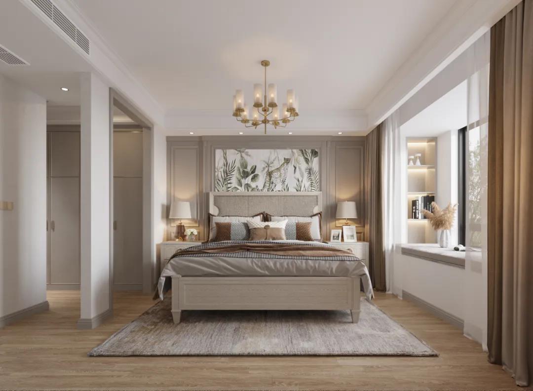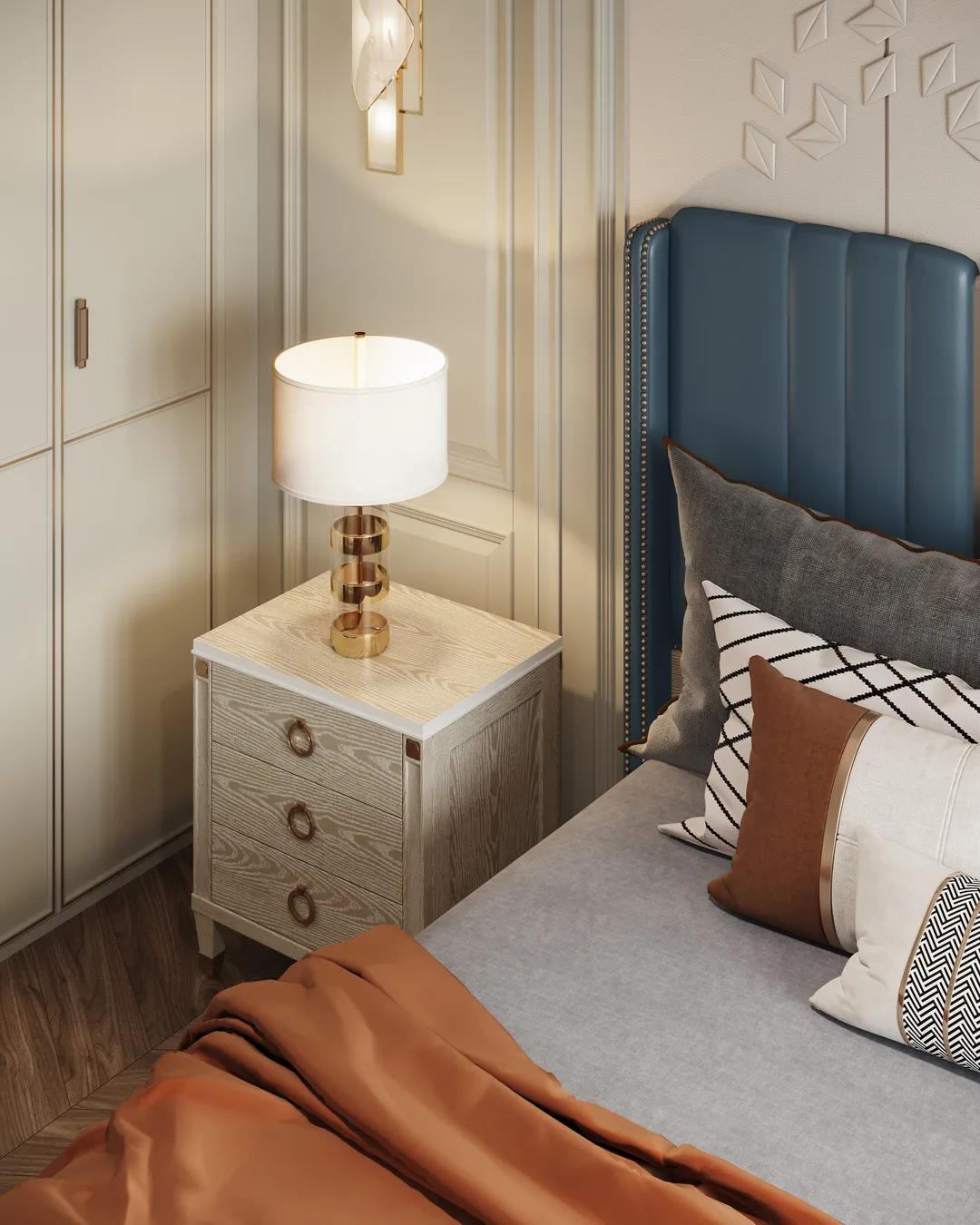 主臥以線條元素做主導,軟包的床頭墻面充滿安全感,浮雕的造型給空間布局帶來了極佳的層次感,以現(xiàn)代美式輕奢框架為主題,融入了美式靈動的線條,讓整個臥室既有時尚質感,又有時光打磨后的穩(wěn)重。