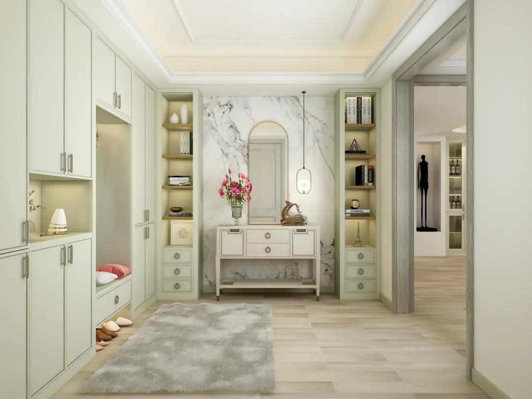 玄關(guān)色調(diào)是時尚的仿古白搭配淺灰,不過多矯飾,