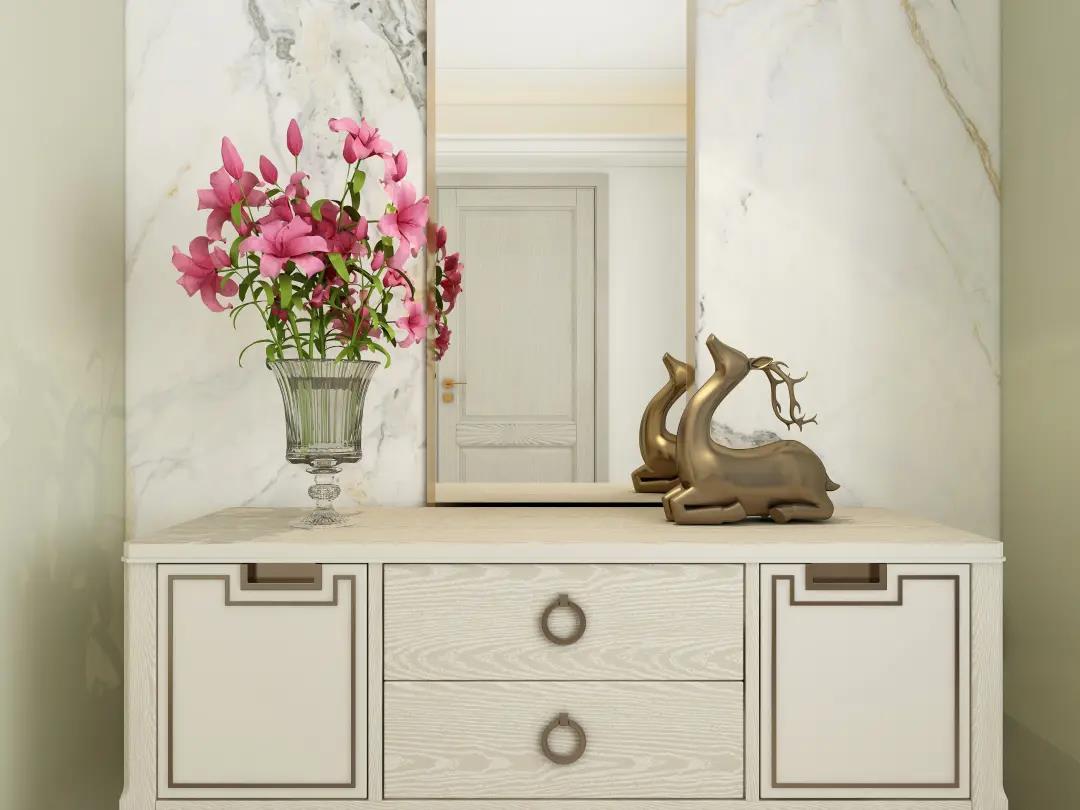 正前方是藝術(shù)大理石搭配仿古白移動玄關(guān)柜,