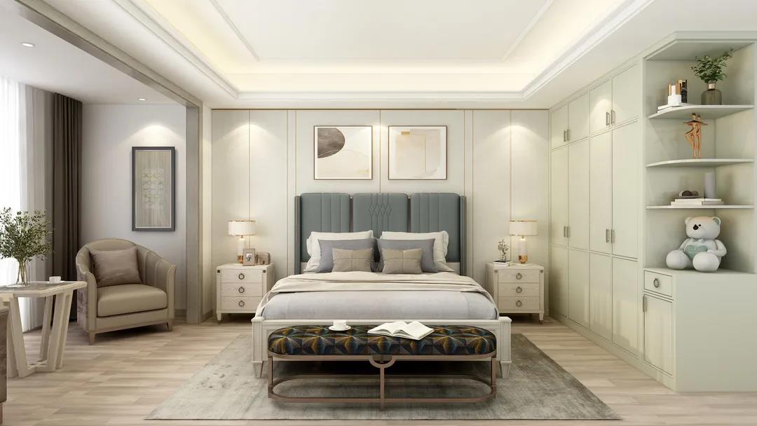 床尾凳的嵌入藍與床頭色調(diào)相呼應(yīng),