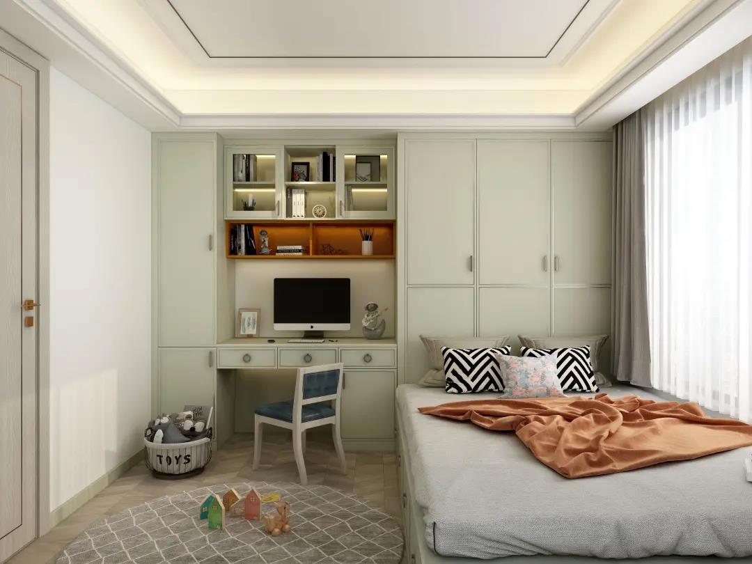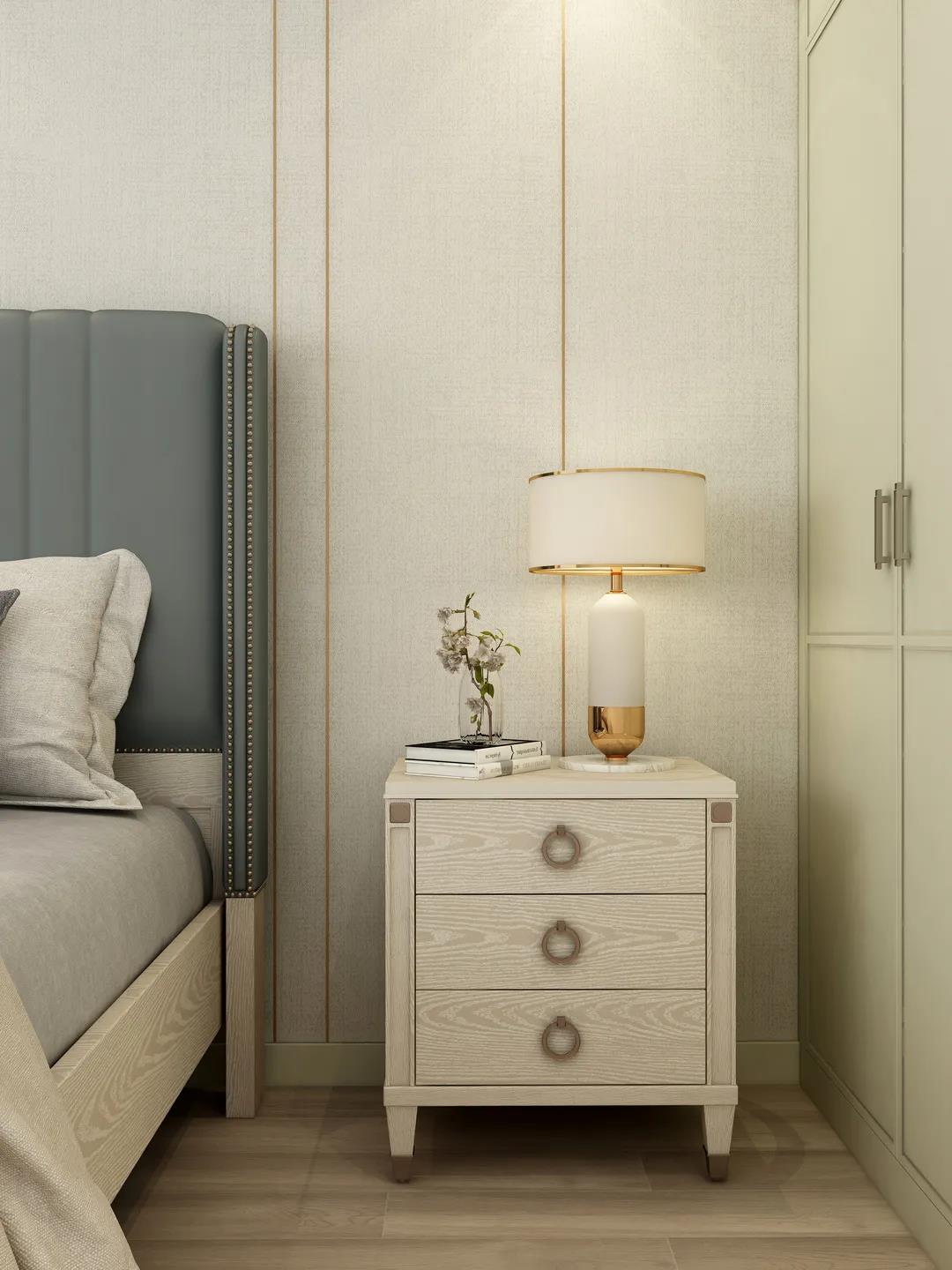 次臥背景墻兩端是對稱式設(shè)計,以淡雅的暖色為主,