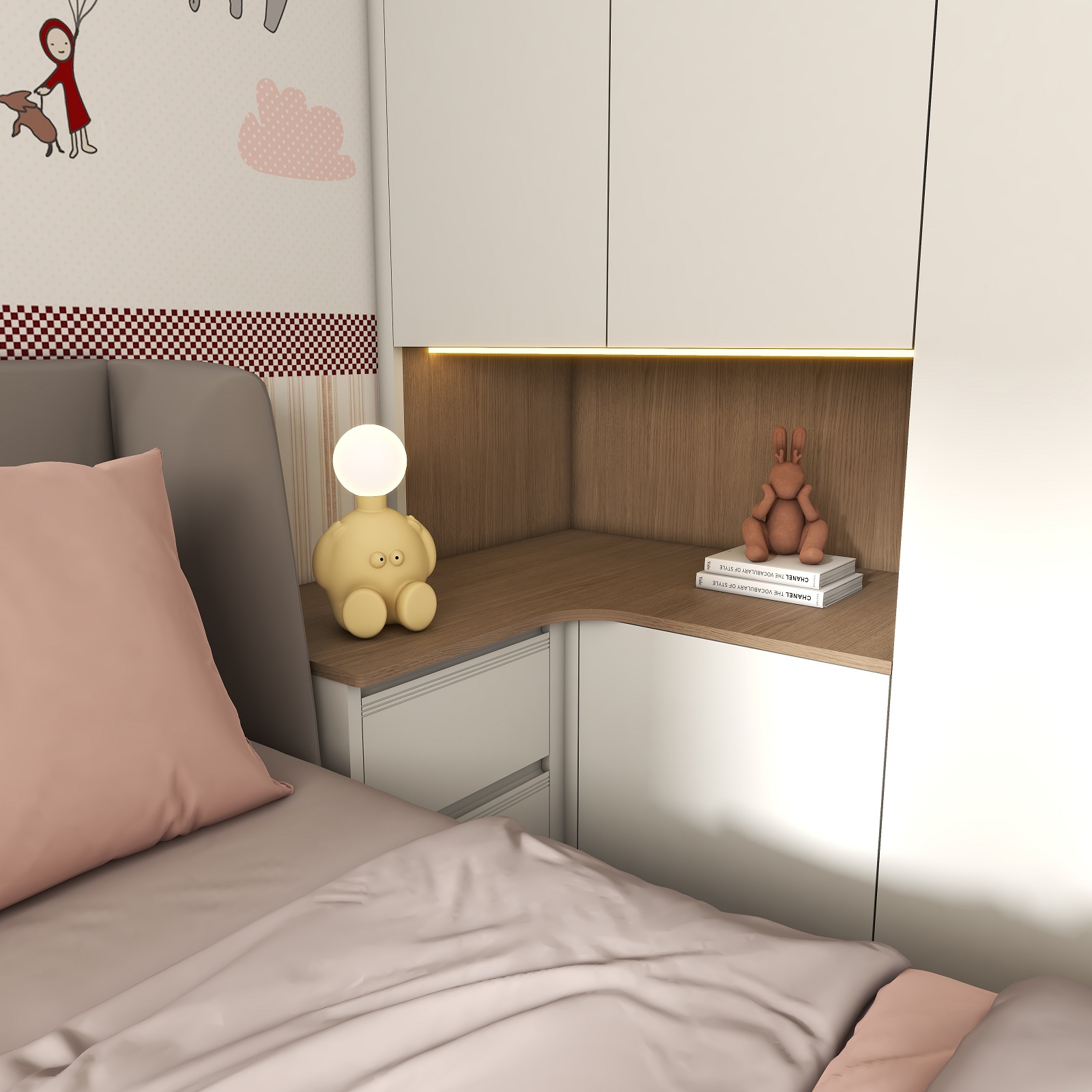 兒童房采用溫柔的奶白作為空間底色,整墻卡通貼畫搭配奶油白衣柜,在細節(jié)上用粉色裝飾作為跳色,無形中增加立體感和層次感,營造出童真舒適的兒童夢中情房。
